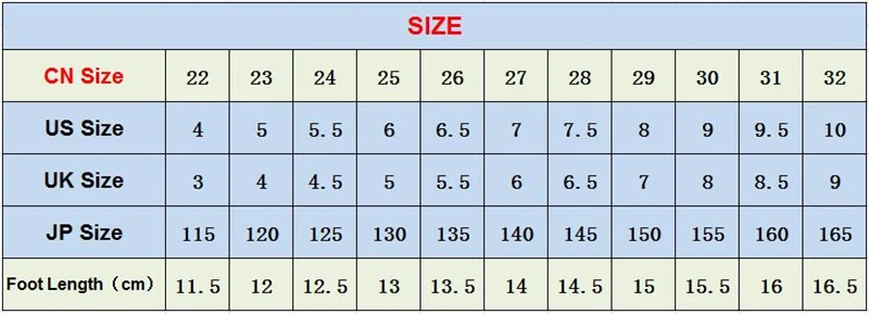Это не европейский размер.Пожалуйста, выберите размер в соответствии с длиной стопы, как показано в таблице размеров ниже. На основе опыта, мы предлагаем вам выбрать больший размер, потому что ваш ребенок будет расти быстро.