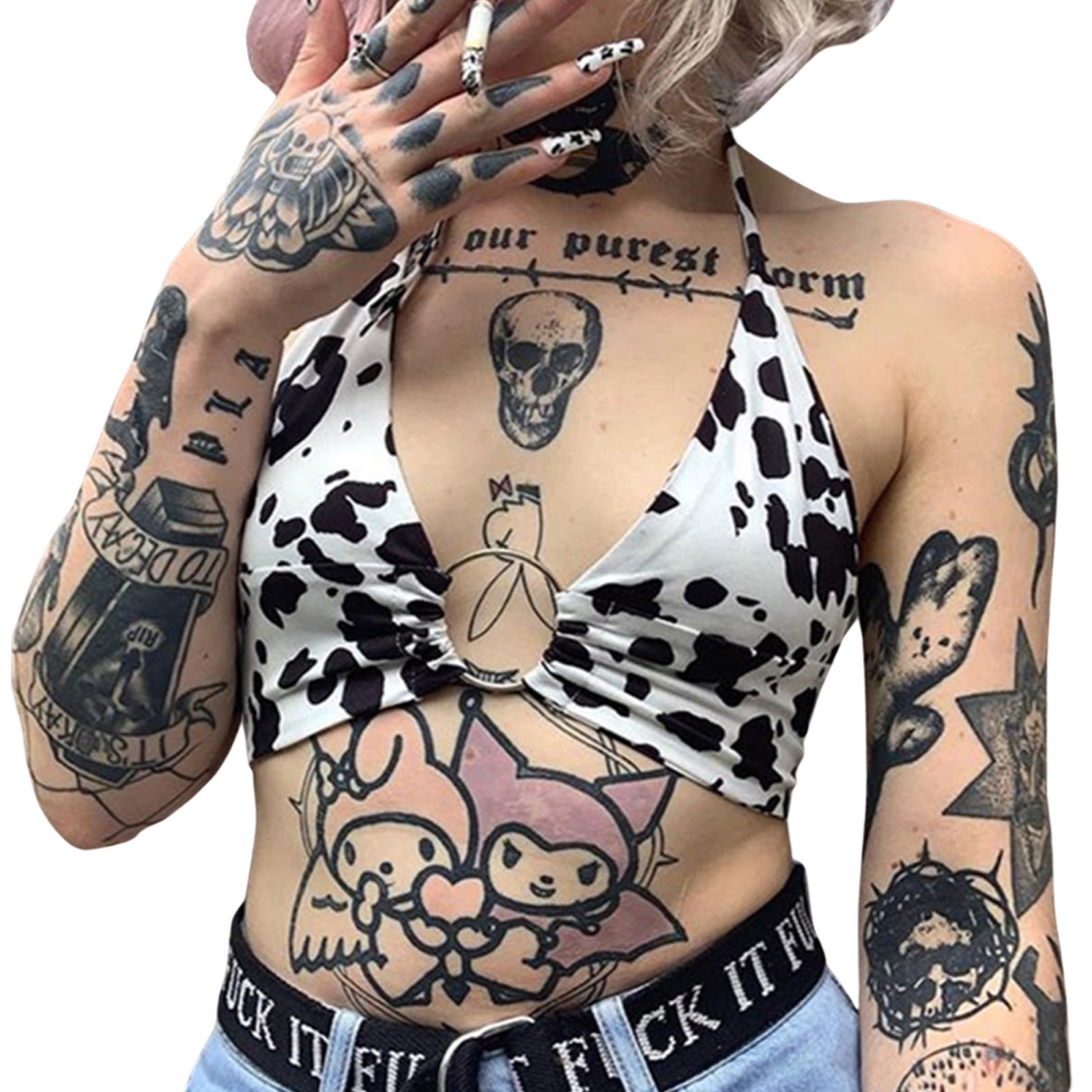 Женский летний укороченный топ с принтом молочной коровы и v-образным вырезом без рукавов с металлическим кольцом