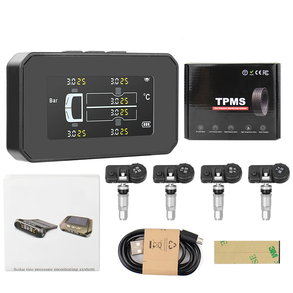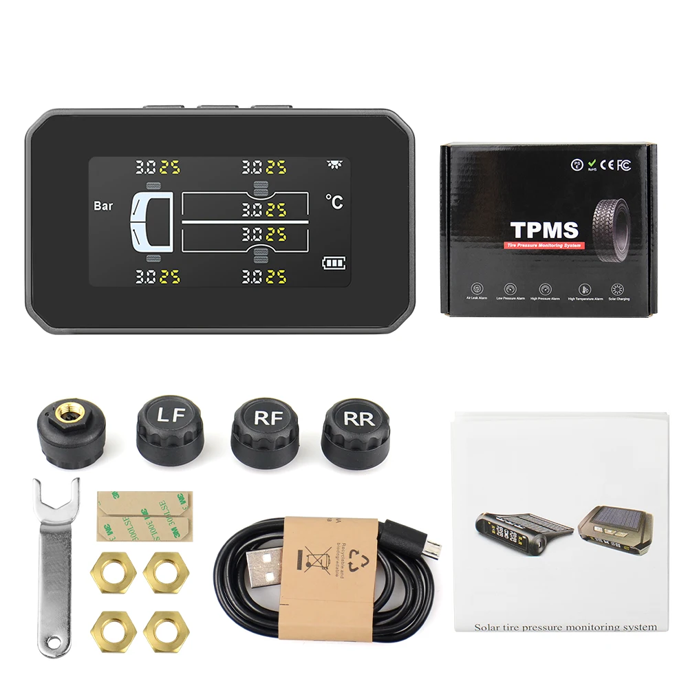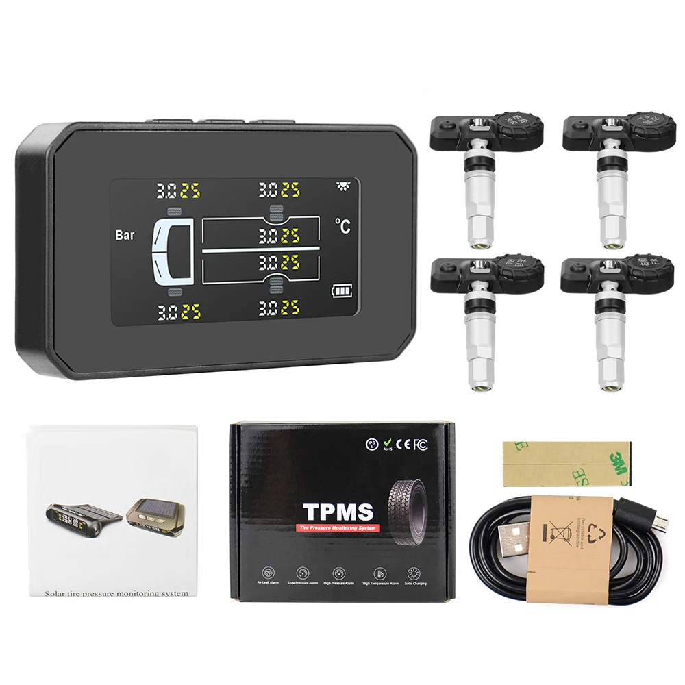 Солнечная энергия и зарядка через USB: интеллектуальная беспроводная система с 2 способами зарядки, которые обеспечивают непрерывную работу системы контроля давления в шинах, перезаряжаемая литиевая батарея для получения электричества может увеличить срок службы шин. Солнечная и USB зарядка Попрощайтесь с традиционной проводкой.