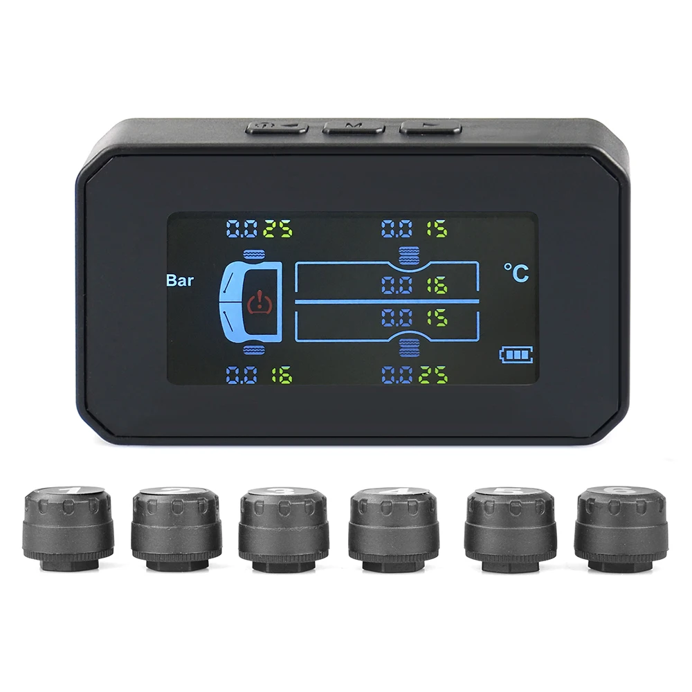 Подходит для 6 шин: максимальное давление в шинах составляет менее 8 бар, мониторинг температуры и давления в реальном времени с высокой точностью для 6 шин одновременно и может автоматически менять соответствующие данные, режим ЖК-дисплея обеспечивает высокое разрешение и гарантирует высокое разрешение и отсутствие брызг экрана.