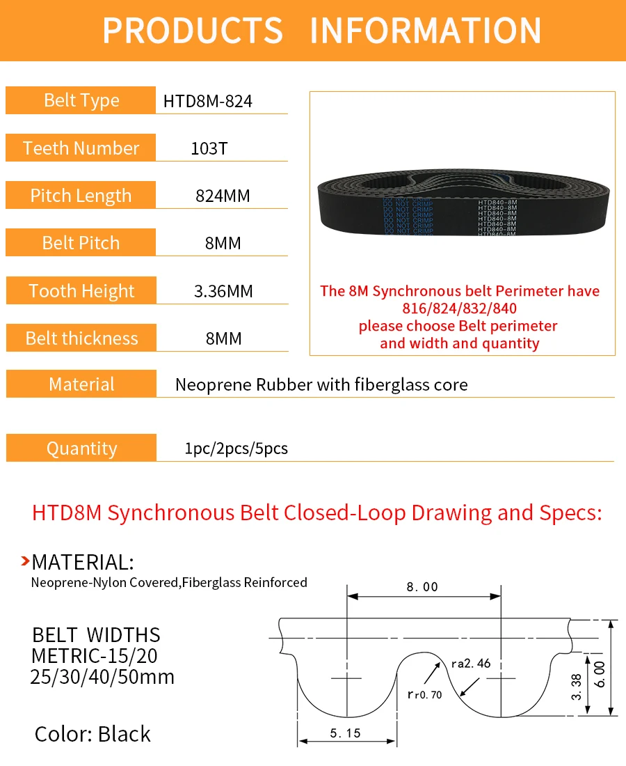 Arc tooth HTD8M Synchronous Belt Perimeter/Pitch Length=816/824/832/840mm Pitch 8mm/0.315inch Teeth Number 102T 103T 104T 105T. Neoprene Rubber Fiberglass in Closed-loop Width 15m/20mm/25mm/30mm/40mm/50mm. HTD 8M Timing Belt suitable for High Torqure Transmisson
