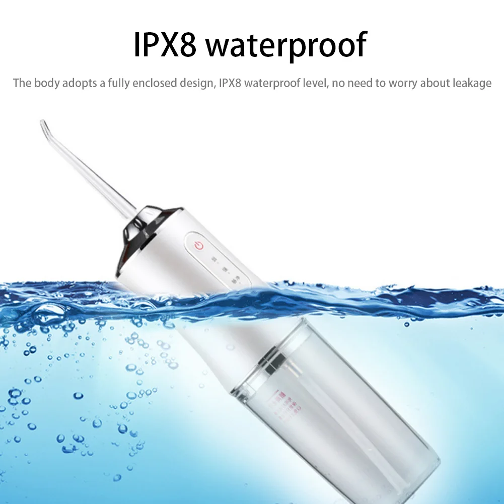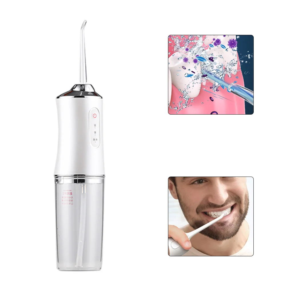 Water flosser -Color:White. -Material:ABS. -Size:21.8x6x8.5 cm/8.58x2.36x3.35 inch. -Portable flusher. -Working methods: standard, gentle, massage. -Power: 5W. -Pulse frequency: 1400-1800 times/min. -Water soluble box: 220ML. -Net weight: 249g.