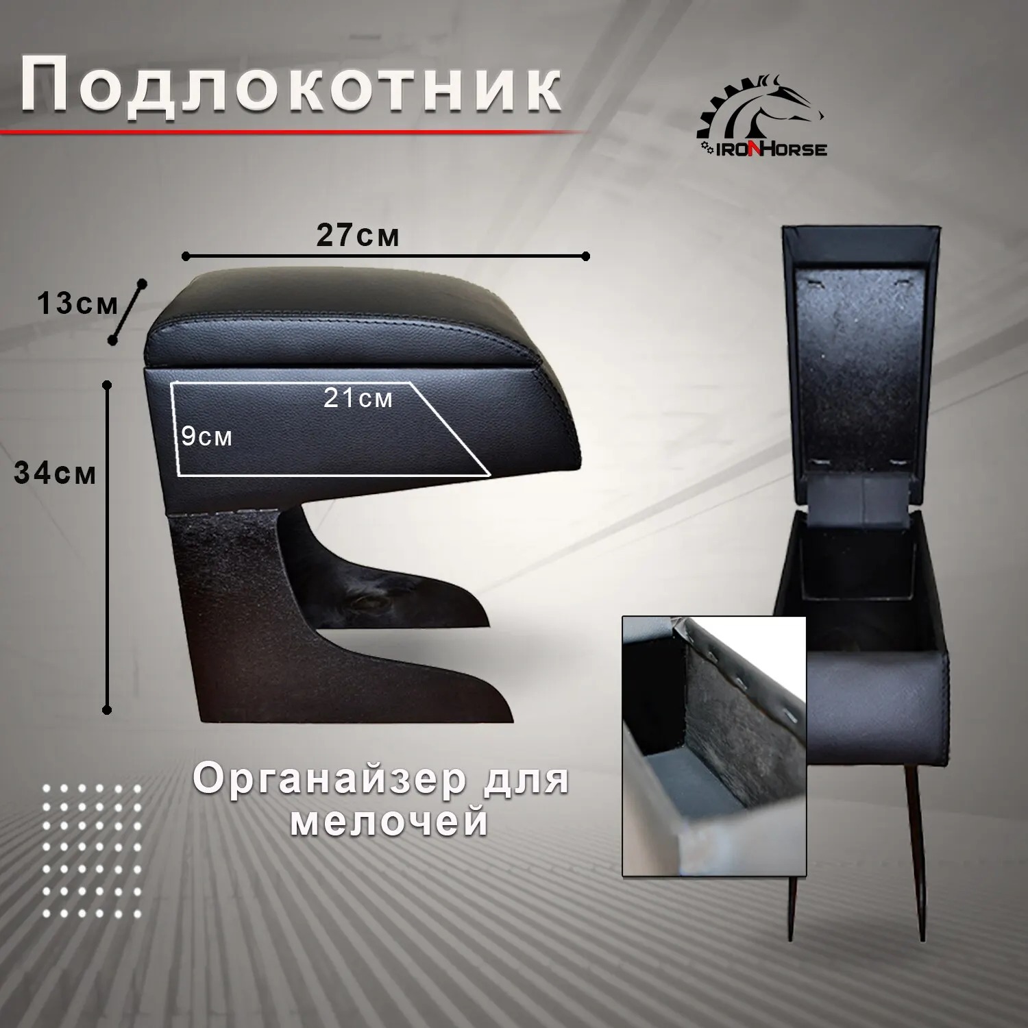 Подлокотник — является важным и стильным аксессуаром для Вашего автомобиля. Он станет для Вас дополнительной опорой, что позволит сделать поездку менее утомительной и снять мышечное напряжение. Также это органайзер для всевозможных мелочей (денег, ключей и т. п.). Подлокотник высокого качества идеально впишется в интерьер Вашего автомобиля. Перетяжка выполнена из качественной Экокожи. Подлокотник устанавливается без лишних крепежей и саморезов не больше одной минуты.
