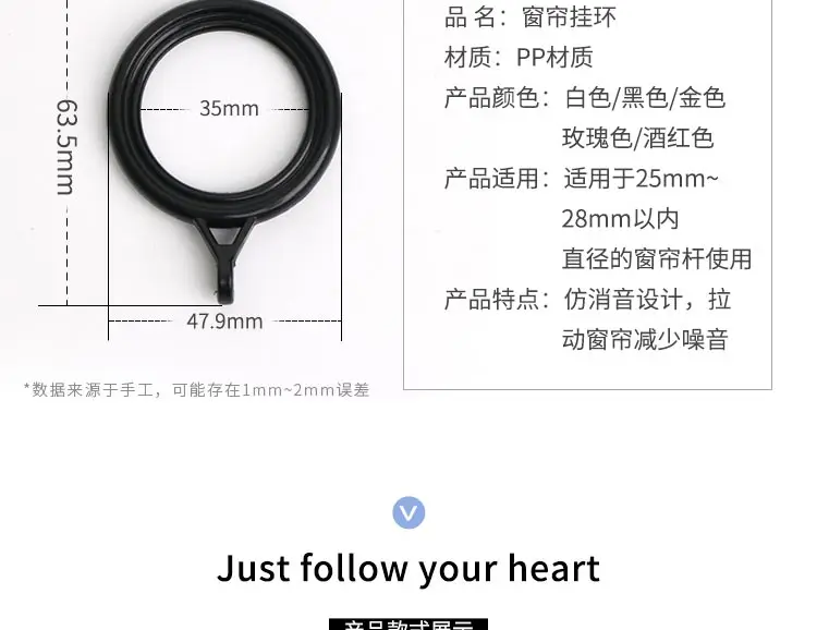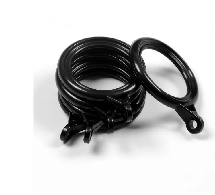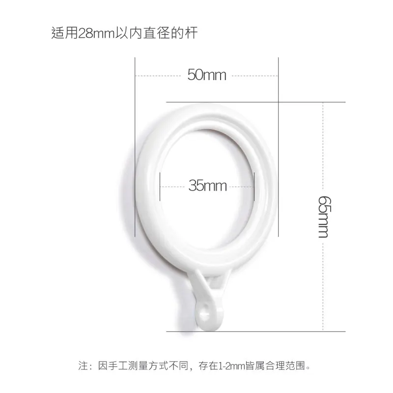 The curtain rod rings are excellent to your bathroom decor. Made of durable plastic material, the rod rings with eyelet is easy to install together use with drapery hooks. The curtain rings measure 1.34 inch inside diameter.