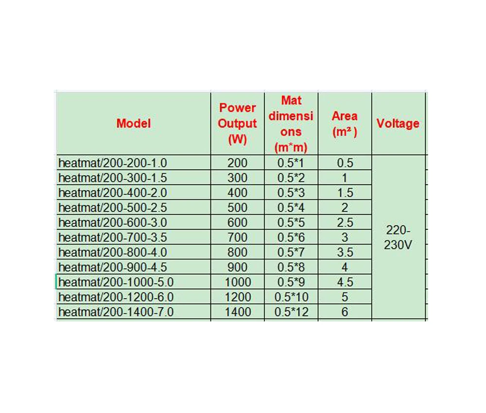 3. Размер коврика: 50 "в ширину, Длина может быть выбран; Напряжение: 240V, ампер: 3,5 A, Ватты: 200W/м². Синий нагревательный элемент нельзя разрезать. Сетчатый материал можно разрезать, чтобы сделать поворот и углы для нагрева практически любой области формы. Более детальный процесс установки приведен в инструкции.