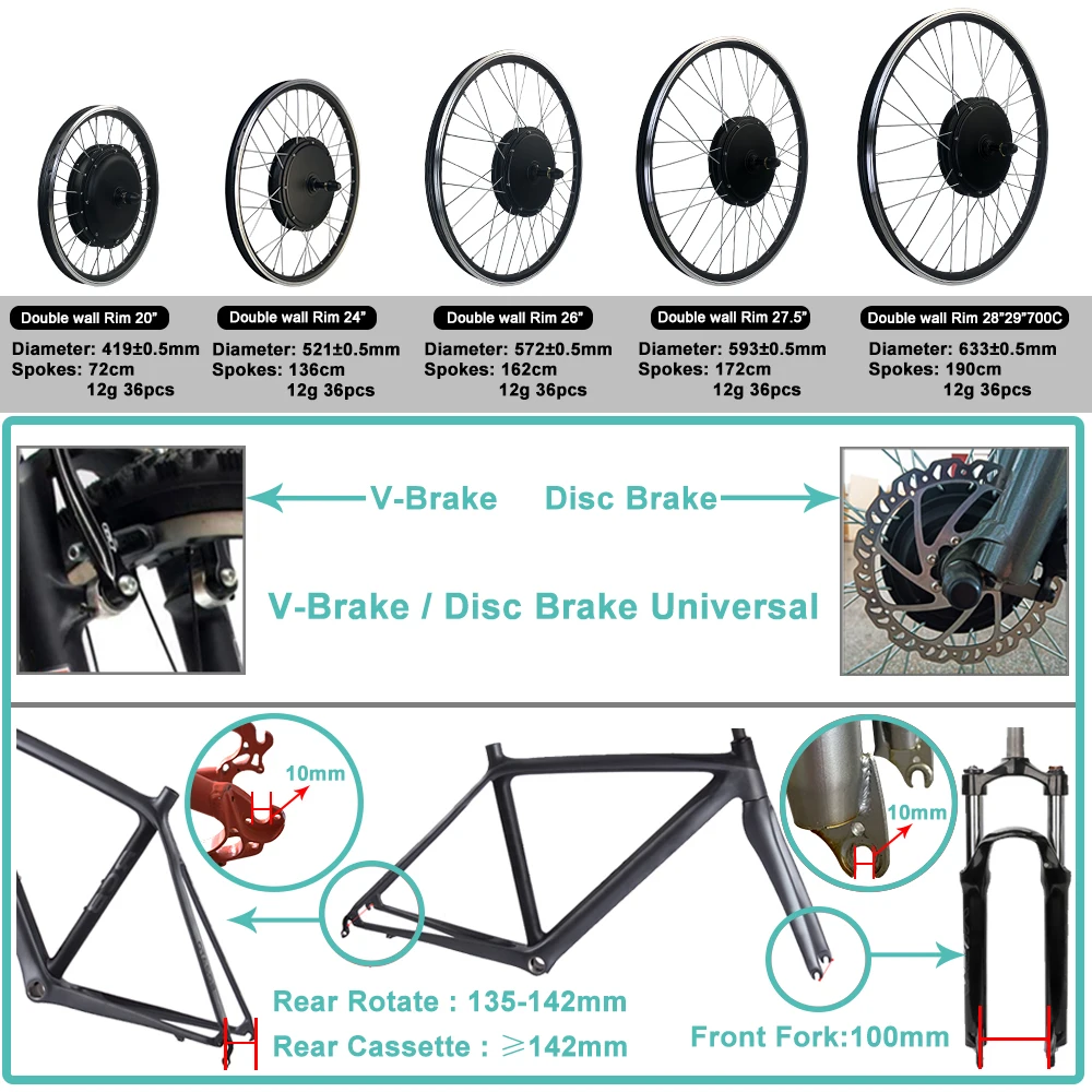 1.Легко конвертировать Колесный комплект для переоборудования электрического велосипеда для велосипеда сЗадний Поворотный Размер вилки «135-142 мм» маховик ≤ 9 скоростей(Задний Кассетный Размер вилки «≥ 142 мм» маховик 8 скоростей) (Размер передней вилки «≥ 100 мм”). Легко преобразуйте ваш велосипед в моторизованный велосипед в течение 2 часов.
