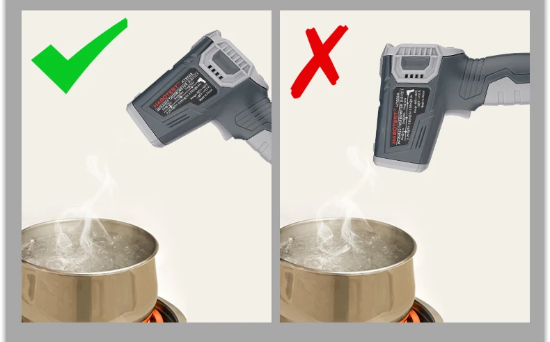 Бесконтактное измерение температуры: Наведите на измеряемый предмет с помощью термометра и нажмите на спусковой механизм, чтобы удерживать температуру непрерывно измеряемой. Ослабьте спусковой механизм и сохраните результат измерения. При измерении, лазерная указка может быть использована, чтобы помочь термометр прицелиться.