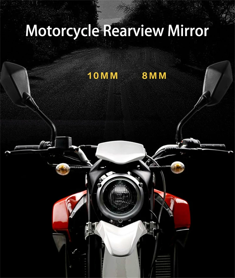 Характеристика: Подходит для большинства мотоциклов Уникальный индивидуальный дизайн, идеально подходит для большинства мотоциклов Поворот на 360 градусов, позволяет расположить под идеальным углом для вашего положения езды Высококачественное прозрачное белое стекло дает четкое видение как днем, так и ночью Легко вставляется, непосредственно крепится к точке крепления на складе. Спецификация: 100% новый и высокое качество Поворот: Регулировка на 360 градусов Материал: АБС-пластик Размер: 8 мм, 10 мм