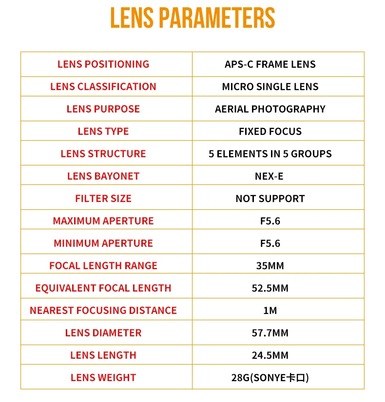 Brand NameKAXINDAModel NumberUAV35F-2OriginMainland ChinaTypeFixed Focus LensWeight100g and belowUseCameraCertificationNONEPackageYesFocus ModeMFLens TypeAutomaticMaximum ApertureF5.6Focus TypeWide Angle-PrimeCaliber57.7mmFocal Length35mmFull FrameNoScene TypeWeddingScene TypeBusinessScene TypeHUMANScene TypeSportsScene TypeInsectScene TypeArchitectureScene TypeSpecialScene TypeSceneryScene TypeStill LifeScene TypeTravelScene TypePeopleLens Stabilization TypeNoneNumber of Diaphragm Blades5 BladesMeasurement unit100000015Each pack1