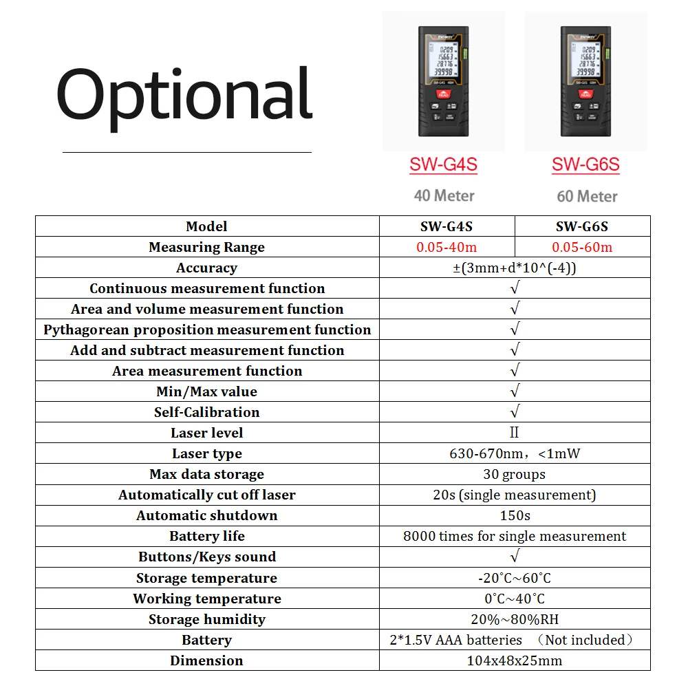 Лазерный дальномер оснащен модернизированным чипом, который может обеспечить мгновенное и точное измерение. Он способен измерять расстояние, площадь и объем. Его также можно использовать для непрямого измерения с помощью теоремы Пифагора. Он имеет мини-размер, который делает его довольно портативным, широко используется в строительной отрасли, особенно для больших площадей, таких как комнаты, квартиры, здания, недвижимость, фабрики и т. Д.