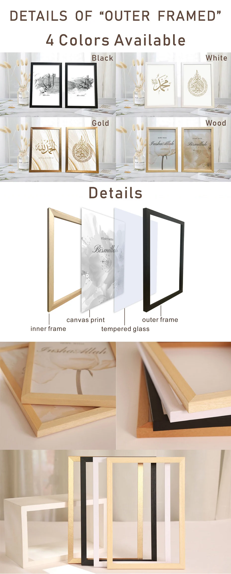 При заказе"Внешняя рамка"Парусиновая печать, есть четыре цвета(Дерево, золото, черный, белый)Рамки на выбор, пожалуйста, сообщите нам цвет рамки, который вы хотите при размещении заказа.
