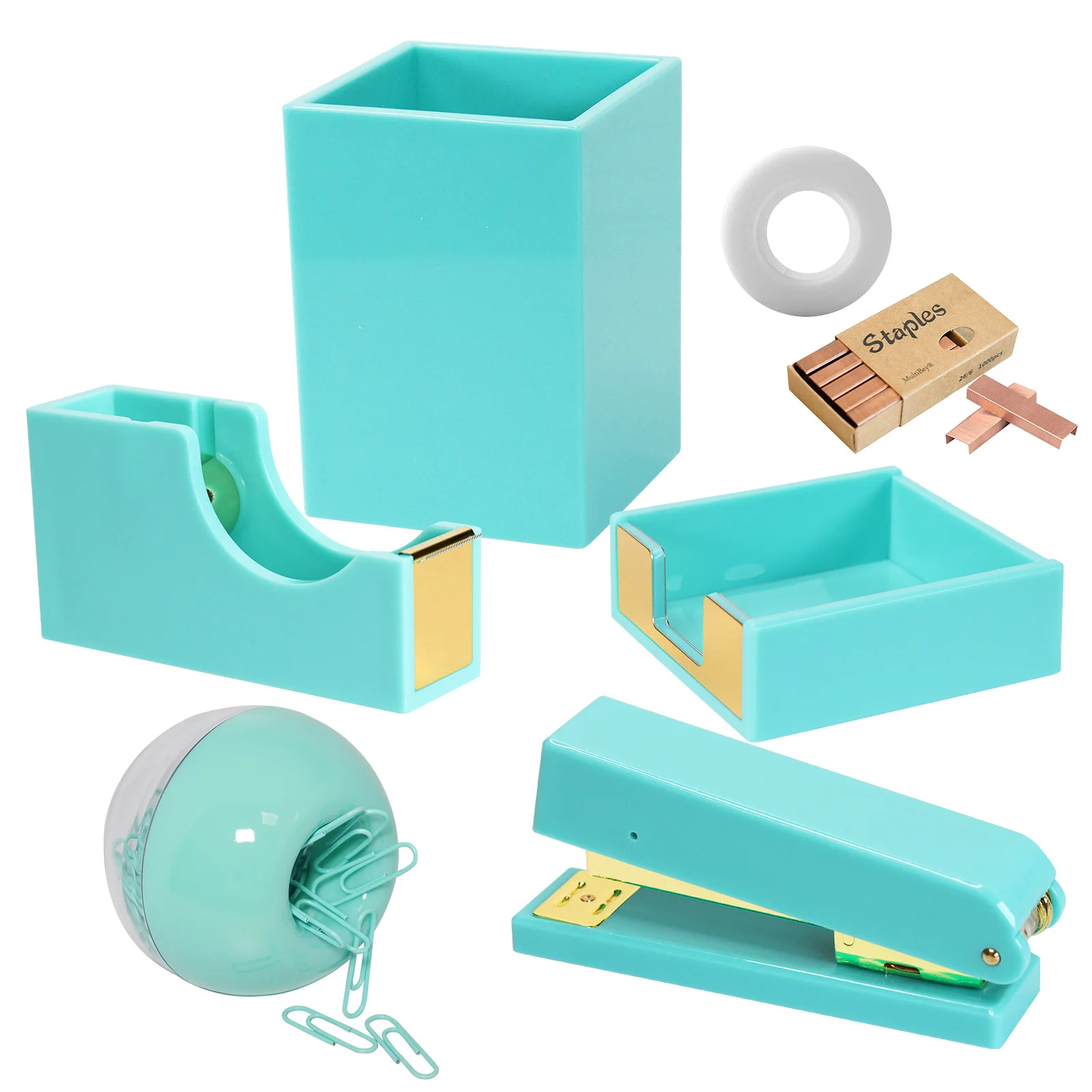 1.▶[В комплект входит]: что вы получаете за один раз? ① 1 контейнер для карандашей/Настольная Ваза; ② 1 дозатор для лент; ③ 1 клейкая лента; ④1 куб для заметок держатель для заметок; ⑤1 сверхмощный степлер; 9960x красные медные конюшни (1 коробка); 1x 1x магнитный держатель для бумажных зажимов, ⑧ 100x скрепки. Завершенный и доступный Исполнительный Настольный набор аксессуаров и органайзеров для вашего рабочего места.