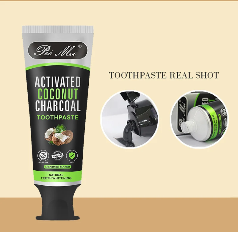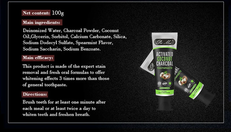 Название продукта: зубная паста с бамбуковым углем и кокосовым маслом (без коробки) Содержание нетто: 100 г Основные ингредиенты: деионизированная вода, Порошок Угля, кокосовое масло, глицерин, сорбитол, карбонат кальция, диоксид кремния, лаурилсульфат натрия, мята, сахарин натрия, бензоат натрия. Основной эффект: Этот продукт изготовлен из профессионального моющего средства и свежей формулы для полости рта, что обеспечивает в три раза больше отбеливающего эффекта обычной зубной пасты. Применение: Чистите зубы минимум в течение одной минуты после каждого приема пищи или Чистите зубы минимум два раза в день, чтобы отбелить зубы и освежить дыхание.