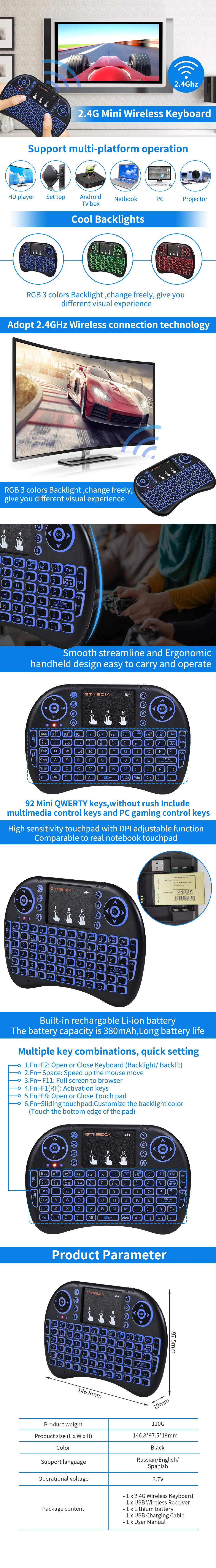2,4G мини-клавиатура с тачпадом, светодиодный подсветкой, мультимедийными кнопками управления и кнопками управления ПК.
