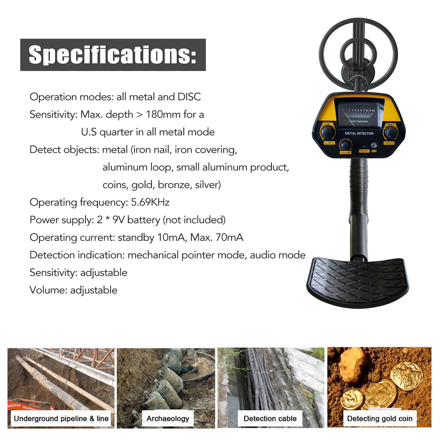 Широкое применение: тестирование металлического инородного тела сырья, топлива и продуктов питания, обнаружение подземных трубопроводов и линий, геологоразведка, обнаружение похороненных сокровищ золота, серебра и металла, приобретение металлолома промышленности, таможни и безопасности инспекции, полиция отдела детективного поиска, Проверка металлических инородных тел при Экспресс-доставке и багаже и т. Д.