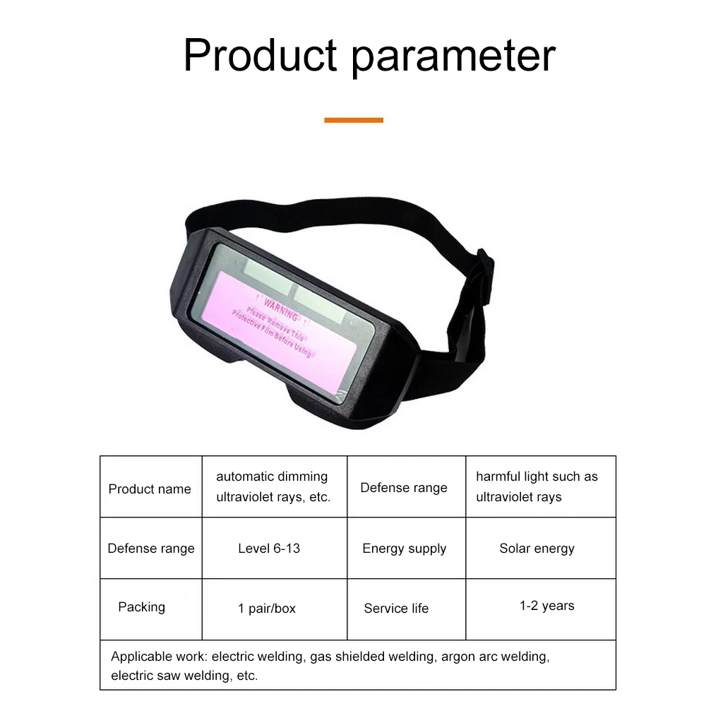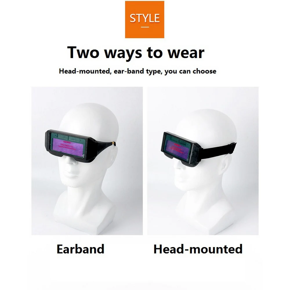 Features:Solar energy dimming automatically, quickly dimmingAnti-slag splash, anti-glareResistance to welding slag, comfortable to wear100% New with high quality.Easy to carry and use.Anti-ultraviolet, infrared radiation, anti-glare, do not stick slag.Ear wear, head wear can switch to each other.New professional goggles to protect your eyes.Specifications:Product name: automatic dimming ultraviolet rays, etc.Defense range: harmful light such as ultraviolet raysShading level: 6-13Energy supply: solarPacking: 1 pcs/boxService life: 1-2 yearsApplicable work: electric welding, gas shielded welding, argon arc welding, electric saw, welding, etc.The package:1PCS Welding goggleNote:(1) All pictures are professionally colored, but due to the different ambient light and different display device settings, there may be some deviations between the pictures you see and the items themselves. Please understand.(2) The data is measured manually, and there may be some deviation, but it does not affect the use.