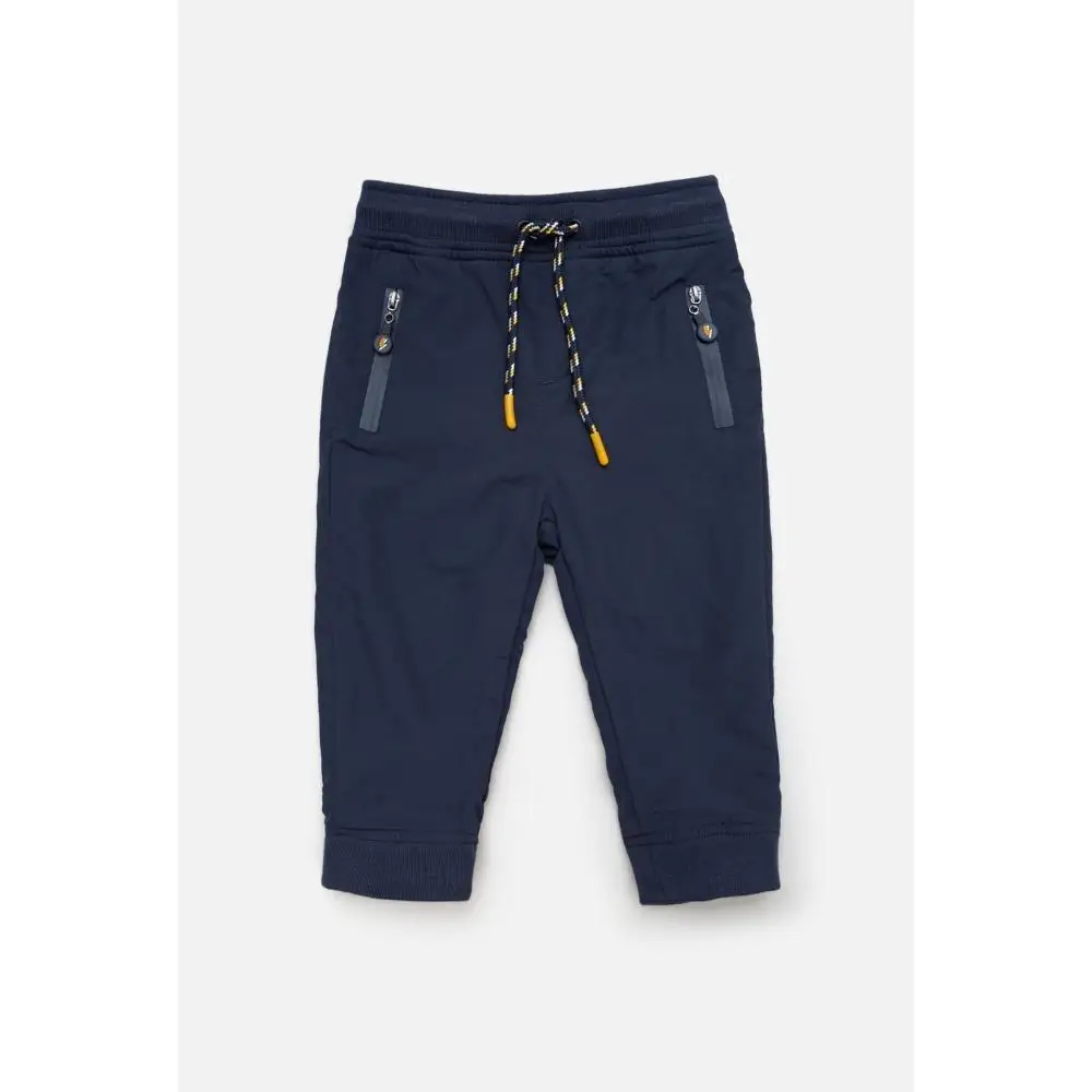 Брюки свободного кроя, выполненные из понжи с водоотталкивающим покрытием на трикотажной подкладке. Пояс на эластичной резинке и кулиске на шнурке. Прорезные карманы на молнии по бокам. Трикотажные манжеты по низу брючин. Подкладка из флиса.