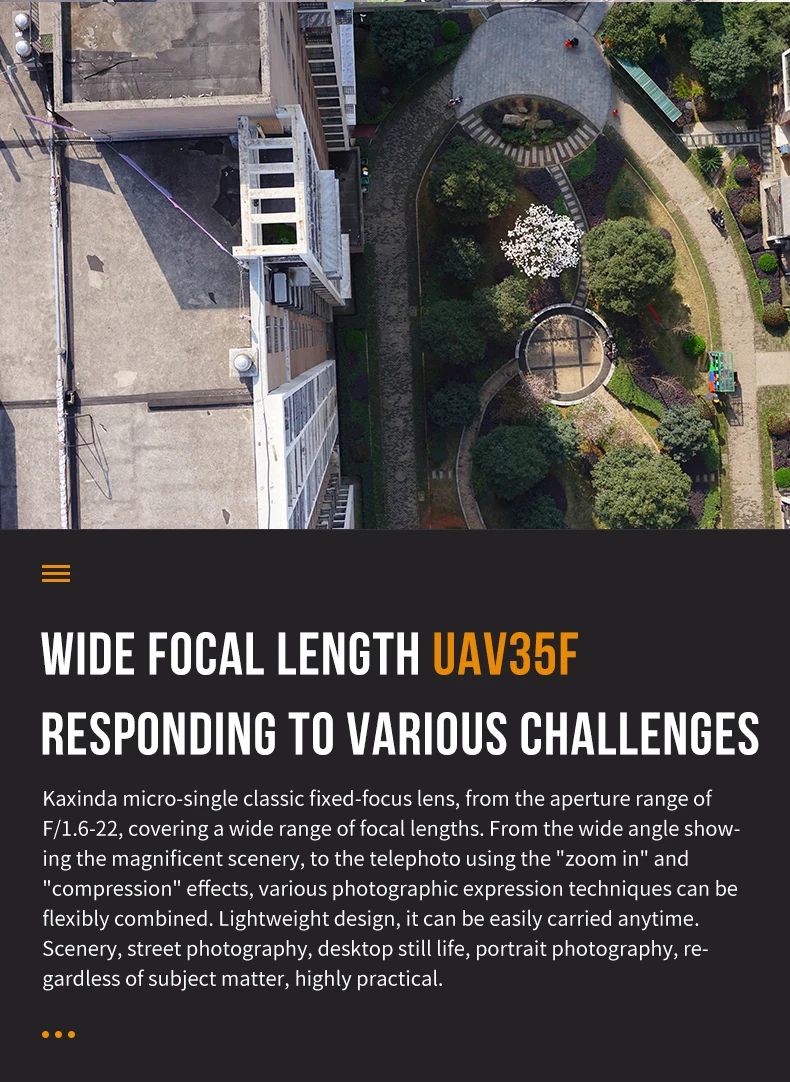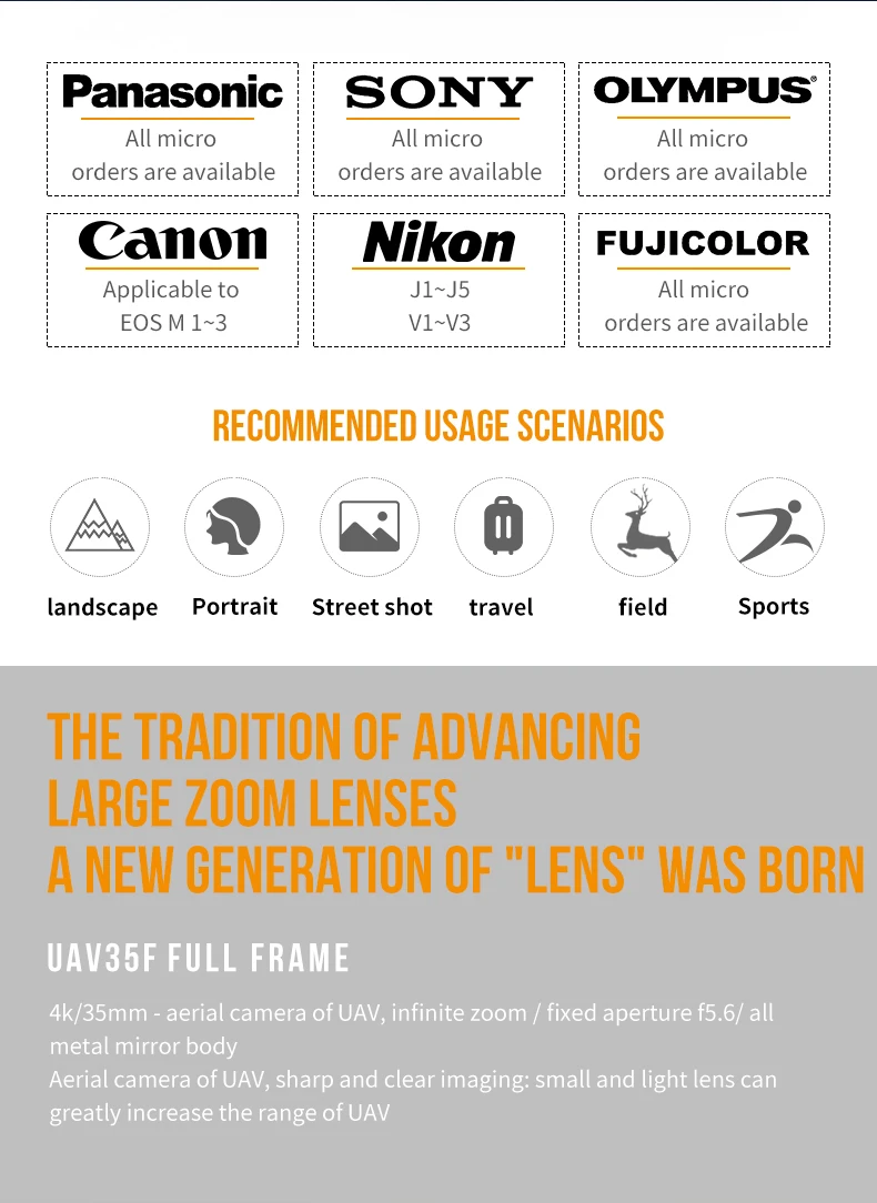 Brand NameKAXINDAНомер моделиFULLFRAME UAV35OriginMainland ChinaTypeFixed Focus LensWeight100g and belowUseCameraCertificationNONEPackageYesFocus ModeMFLens TypeAutomaticMaximum ApertureF5.6Focus TypeWide Angle-PrimeCaliber25.2mmFocal Length35mmFull FrameYesScene TypeWeddingScene TypeBusinessScene TypeHUMANScene TypeSportsScene TypeInsectScene TypeArchitectureScene TypeSpecialScene TypeSceneryScene TypeStill LifeScene TypeTravelScene TypePeopleNumber of Diaphragm Blades7 BladesMeasurement unit100000015Each pack1