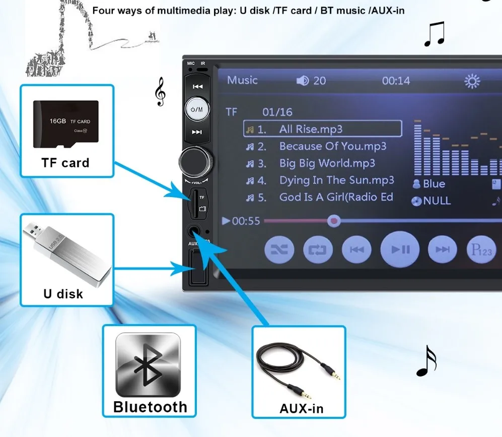 ◑Поддержка высокой емкости TF / MMC до 32 г (не входит в комплект), usb-драйвер, MP5 плеер.