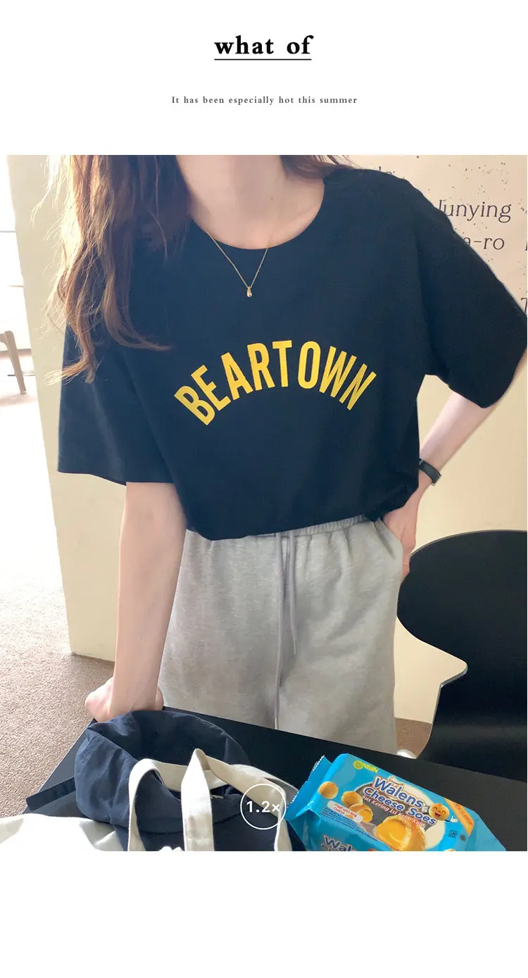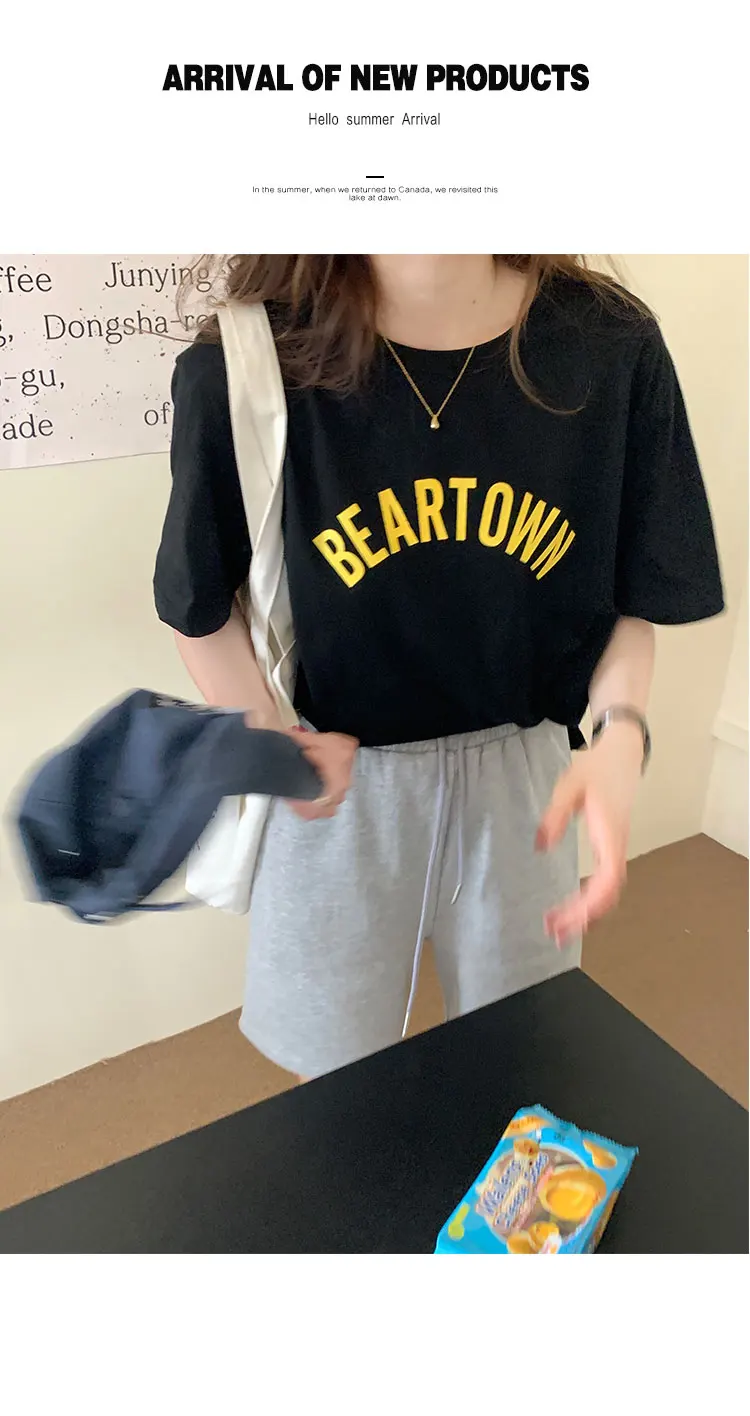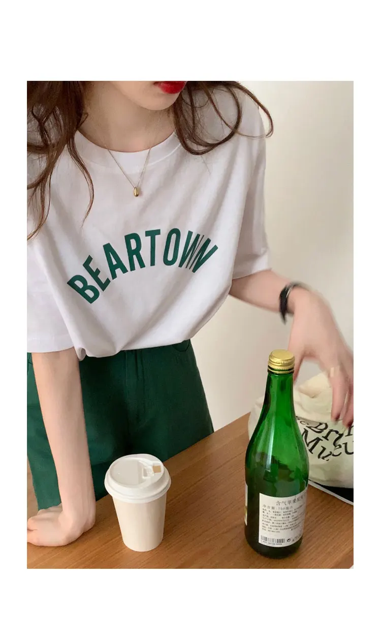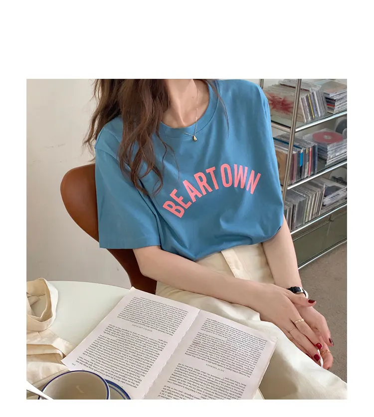 Женская футболка с коротким рукавом и буквенным принтом, 4 цвета, свободные топы в Корейском стиле на лето 2021 Информация о размере Ширина плеч: 47 см/18,8 дюйма, Обхват груди: 112 см/44,8 дюйма Длина одежды: 63 см/25,2 дюйма Длина рукава: 22 см/8,8 дюйма Измерено вручную, допускается погрешность в 1-3 см Описание товара