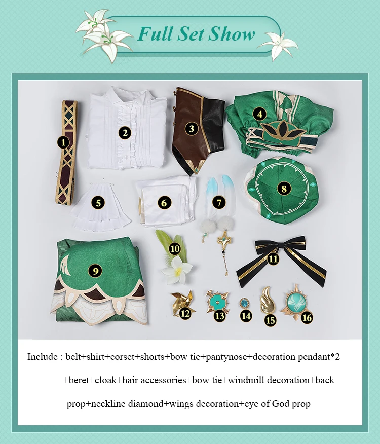 Включает в себя: Пояс + рубашка + корсет + шорты + галстук-бабочка + трусики + украшение в виде подвески * 2 + берет + плащ + аксессуары для волос + галстук-бабочка + украшение в виде мельницы + опора на спине + вырез со стразами + украшение в виде крыльев + украшение в виде глаз божья опора