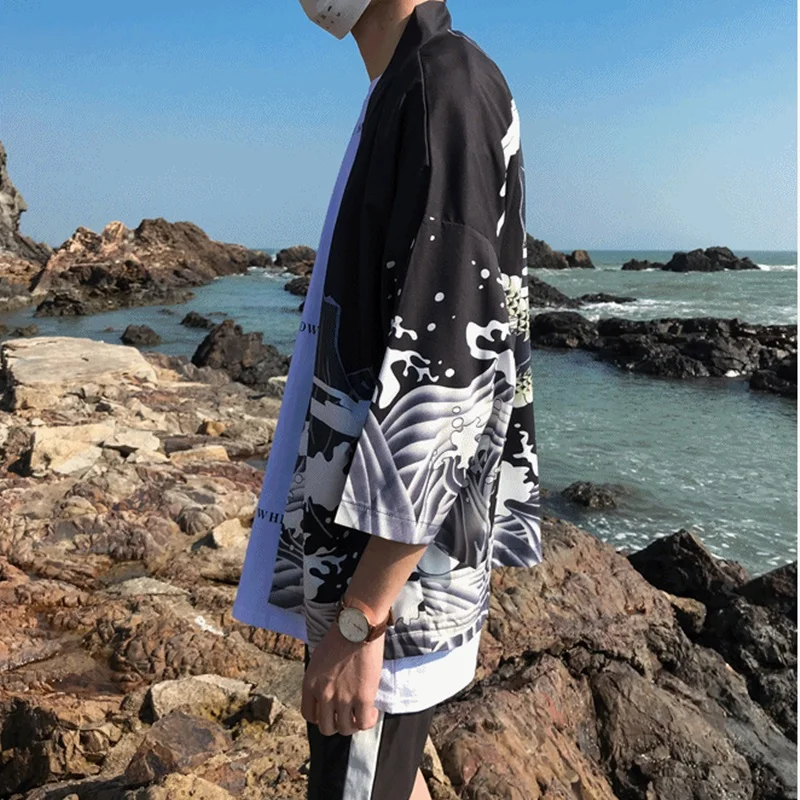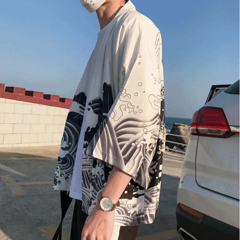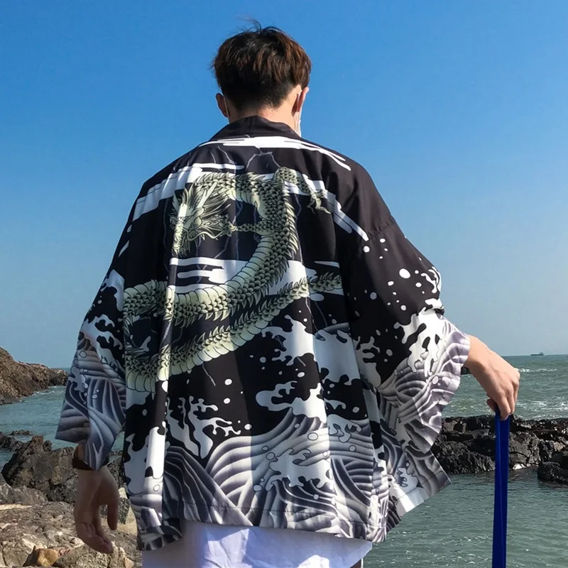Модное пляжное кимоно с японским огненным принтом и шорты халат мужские рубашки