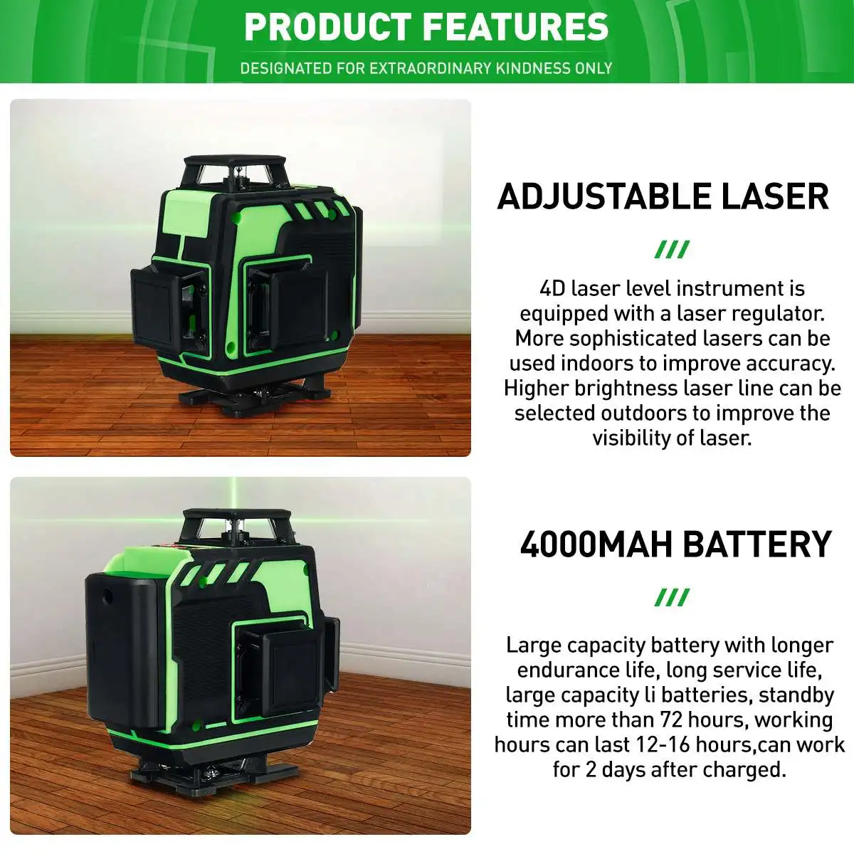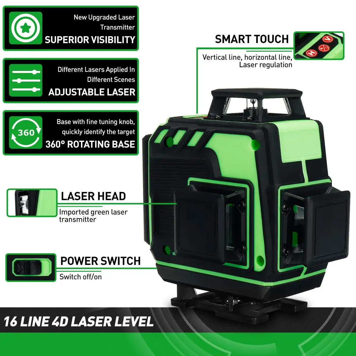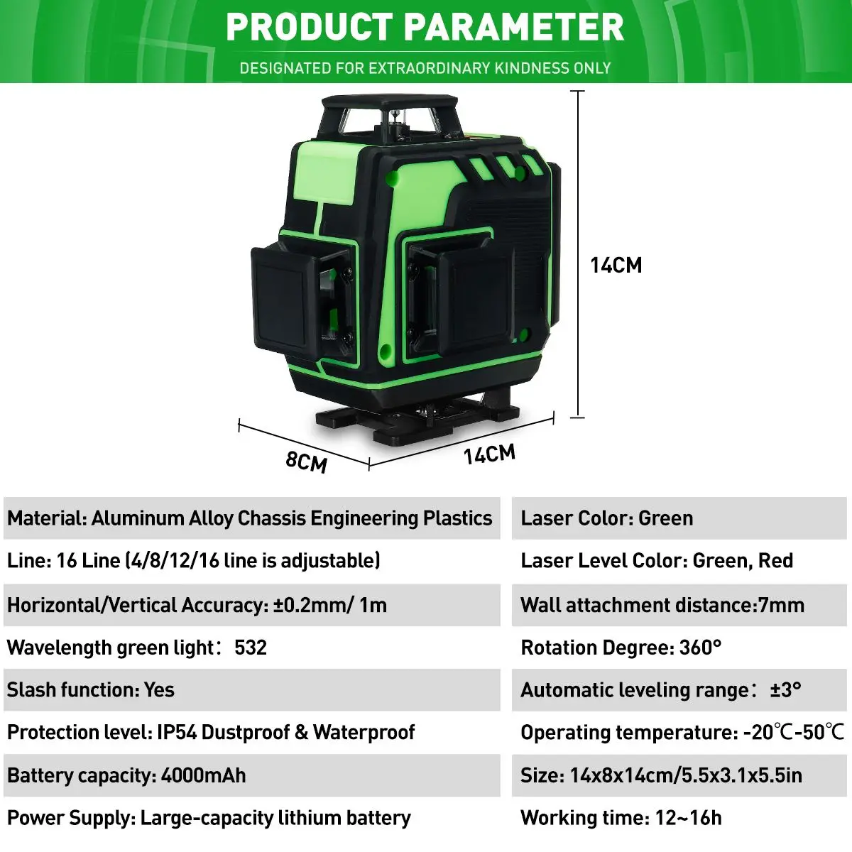 16 линий 360 ° Горизонтальный Вертикальный крест 4D зеленый светильник лазерный уровень самонивелирующийся супер мощный лазерный луч Особенности: 1. 4D 16/12/8 облучение линии, 360 ° без мертвого угла 2. Крытый и открытый универсальный, высокая яркость зеленый, крытый и открытый четко, Дальняя проекция расстояния, высокая Лазерная высота, четкие линии. 3. Точное измерение и более удобное в использовании. 4. Линия 8/12/16 может быть необязательной, подходит для различных случаев для удовлетворения различных инженерных потребностей. 5. Crashworthy и анти-стук, 4D мягкая резина одетая, crashworthy и анти-стук. 6. Международный стандарт IP54 Водонепроницаемый и пыленепроницаемый, многократная защита, длительный срок службы в суровых условиях. 7. Аккумулятор большой емкости 4000 мАч с более длительным сроком службы, долгим сроком службы, литиевые батареи большой емкости 4000 мАч, время работы в режиме ожидания более 72 часов, рабочие часы могут длиться 12-16 часов, может работать в течение 2 дней после зарядки. 8. С помощью штатива вы можете работать с наклонной линией 180 ° 9. ± 3 ° автоматическая функция самовыравнивания. Звуковое предупреждение при превышении диапазона автоматического выравнивания. 10. Светодиодный дисплей питания на батарее