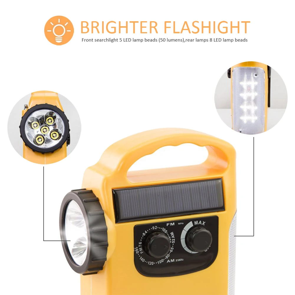 ✔4 вида зарядки: Это солнечная батарея, рукоятка, батареи и 5 В DC USB 4-полосный фонарь для наружного использования. Вам не придется беспокоиться о недостатке электричества в любой чехол.✔Необходимо для аварийной ситуации: Держите свое домашнее хозяйство подготовленным с этим AM/FM и погодным оповещением радио, AM 530 KHZ-1710KHZ, FM 87,5-108MHZ или 76-90MHZ, затем вы можете слушать любимую радиостанцию AM или FM.✔Радиоприемник 3-в-1: AM/FM радио и 5 светодиодный точечные лампы (50 лм) для передней панели поиска светильник, 8 Светодиодный светильник бусины сзади светильник + 500 мАч power bank. Используйте его, чтобы светильник находился в темноте или чтобы ваша комната была светлой после того, как шторм вырубит энергию.✔Подходит для большего количества окнов: это компактное и легкое аварийное радио может быть с вами во многих окнах, особенно в уличных окнах, таких как кемпинг, туризм, рыбалка и т. д.✔Тревога SOS с мигающим красным светильник: Обратитесь за помощью в чехол, у вас есть аварийная ситуация или вы хотите кого-то еще.Уличный аварийный фонарь:Светодиодный фонарь Динамо на солнечной батарее с радио и сиреной-хороший инструмент для активного отдыха. Его функция ручной работы может использоваться без какого-либо источника питания. Изготовлен из прочного пластика с высокой ударопрочностью, подходит для различных сцен использования, таких как кемпинг, рыбалка, путешествия и скалолазание. Это также необходимое аварийное снабжение в то же время в чрезвычайных ситуациях.4 способа зарядки:● Зарядка Micro USB:Он может быть полностью заряжен в течение 6-7 часов. Не заряжайте его более 8 часов.● Солнечная панель:Это 35-60 мАч, когда батареи изменяются. Он может быть полностью заряжен под прямыми солнечными лучами в течение более 15 часов.● Рукоятка:Через 1 минуту намотки (130 поворотов/минут) 5 светодиодный индикатор может работать 12 минут и светодиодный светильник может работать 8 минут. Радио может работать 25 минут, но это зависит от громкости.● 3 * AA сухая батареяПодготовка к аварийной ситуации:● 4 вида методов зарядки могут гарантировать, что в любой чехол не будет нехватки энергии.● Он разработан со встроенным предупреждающим устройством и динамиком. Уровень звука сирены может быть до 90 дБ.● Супер яркий фонарик с 5 светодиодный, аварийная лампа с 8 светодиодный.● Включите кнопку изменения и включите мобильный телефон для зарядки.![]()
