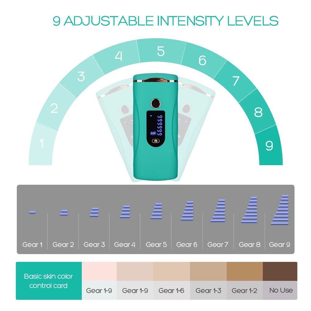 2. Девять уровней интенсивности регулируемый светильник может широко соответствовать различным типам кожи, может использоваться для удаления волосков ног, рук, подмышек, области бикини, груди, спины, подбородка и так далее.