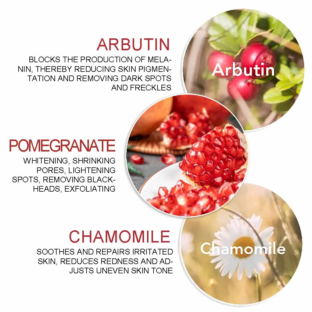 5. Основной ингредиент: экстракт граната, арбутин, фруктовая кислота, шафран, жемчужный порошок, алоэ и другие косметические растительные экстракты