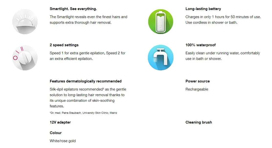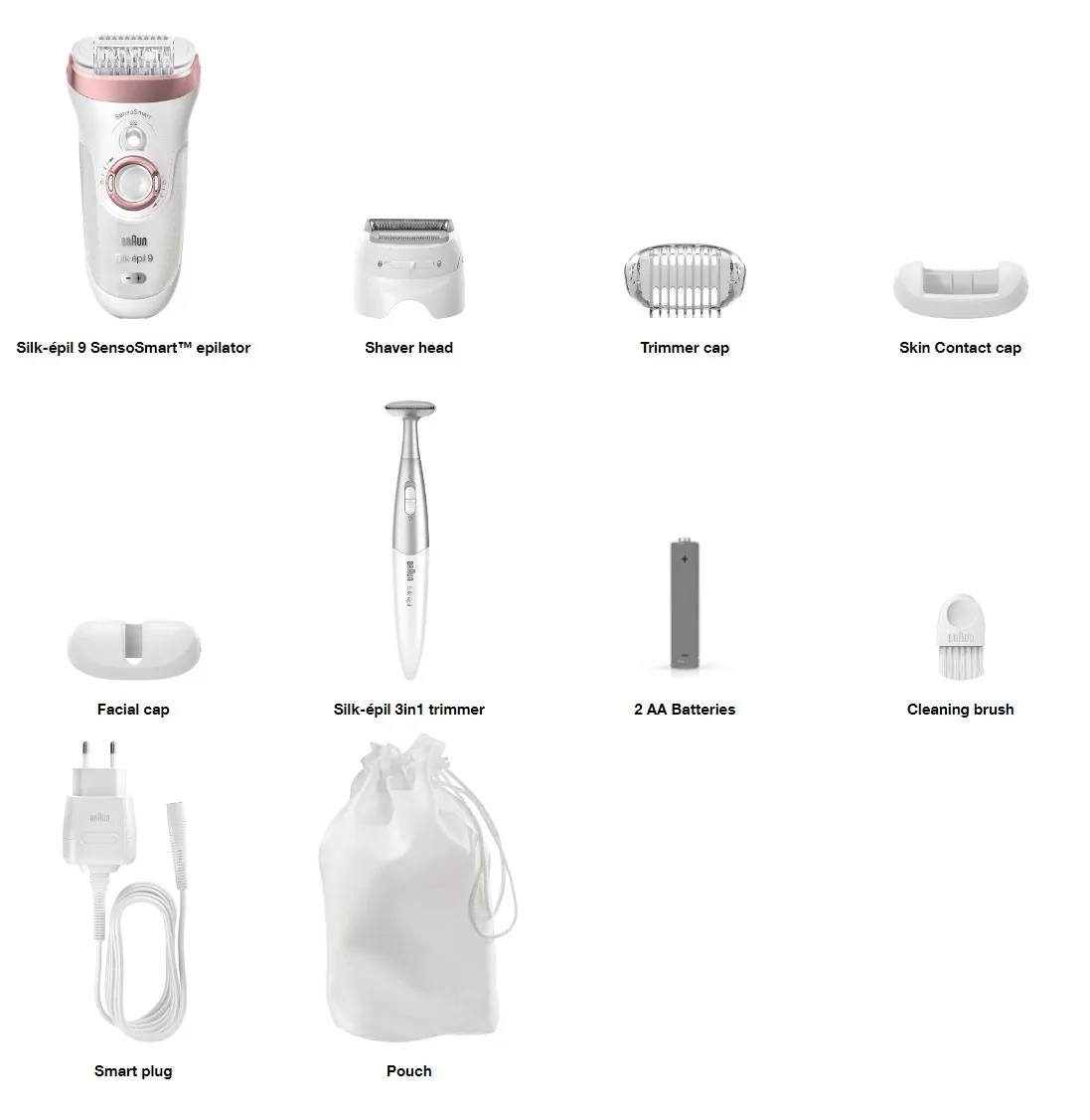 Braun Silk-ébattery 9 SensoSmart™Эпилятор-первый в мире умный эпилятор. Он включает в себя все технологии датчика давления, чтобы направлять ваши эпиляции и удалять еще больше волос в один ход. 40% эпилятора волос головы на 4x короче, чем воск. Беспроводной и влажный и сухой, Эпилятор можно использовать в ванной или душе. С 4 аксессуарами, включая триммер для тела и лица для легкого ухода за чувствительными участками.