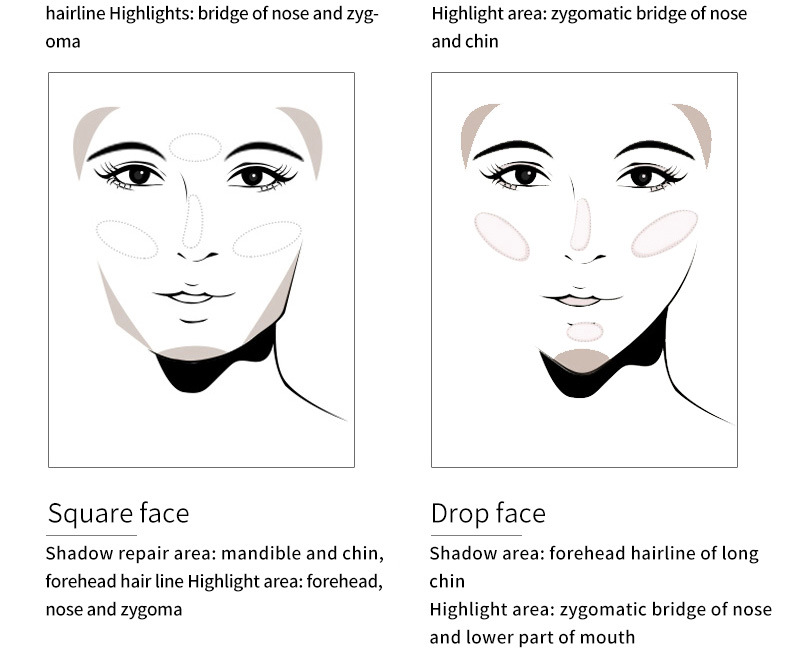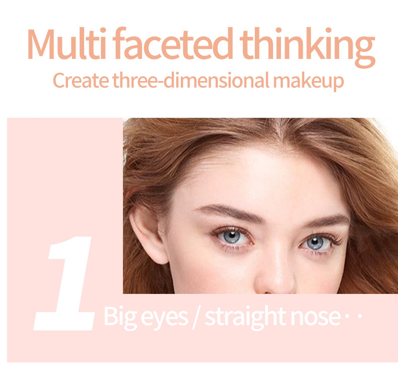 1. Легкий макияж, улучшает особенности лица: пудра тонкая и гладкая, легко наносится макияж. 2. Макияж высокого качества, который не легко удалить: тщательно разработанный, водонепроницаемый и анти-пот формула, чтобы поддерживать красивый эффект кожи, контуры теней, показывая красивую сторону. 3. Глубокий контур, трехмерный переносица: пара головок, с глянцевыми тенями, также может создавать глубокие и очаровательные черты лица.
