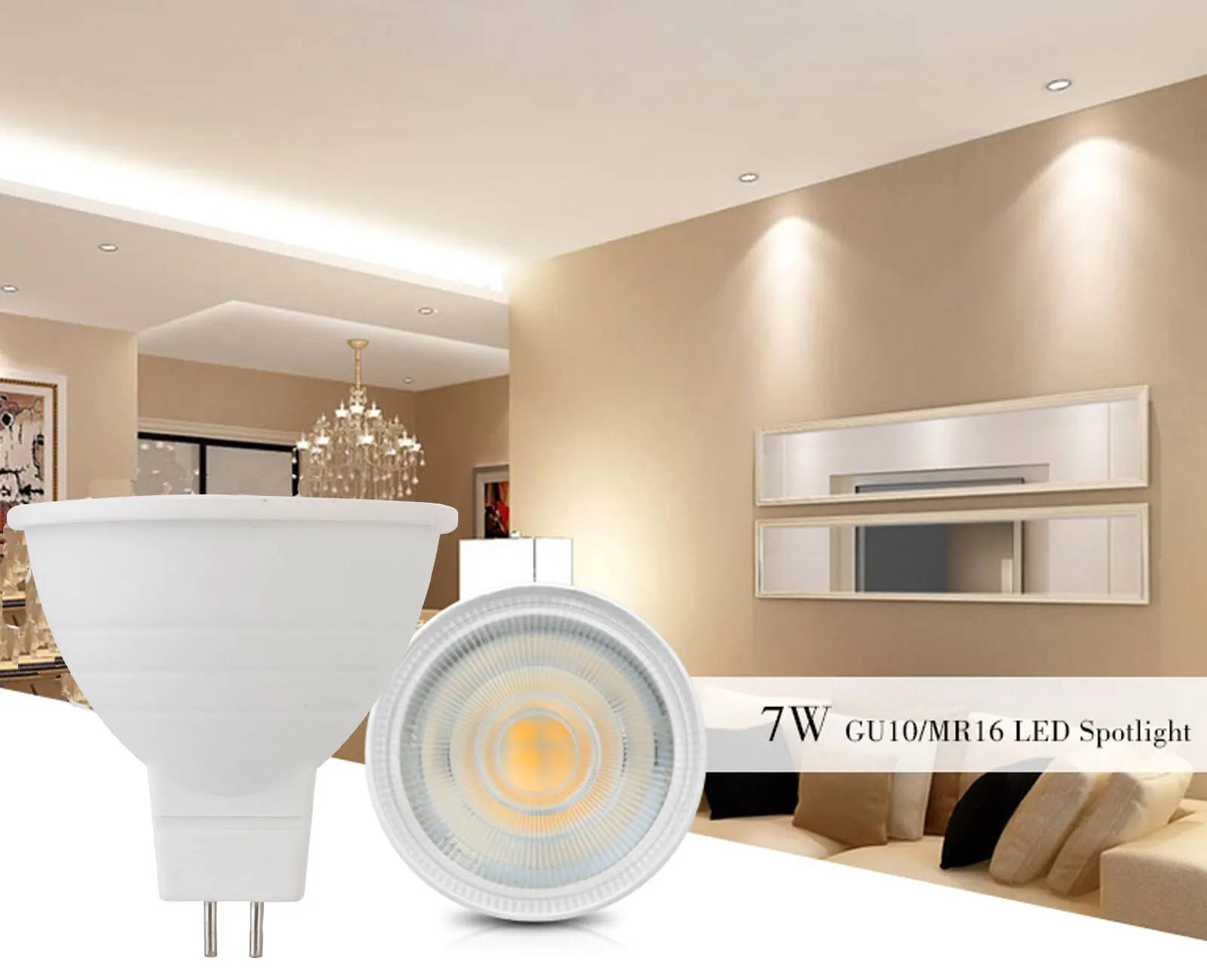 Мощность: 7 Вт Напряжение: 110 В переменного тока 220 В Разъем: MR16/GU10 /GU5.3 Цветовая температура: холодный белый 6000-6500K, теплый белый 2700-3000K Угол свечения: 24 градуса Срок службы: более 20000 часов Материал: ПК + алюминий