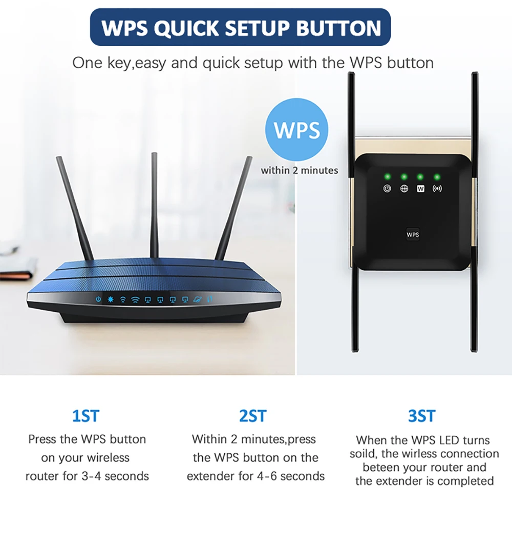 3ST, когда светодиодный WPS становится однородным, беспроволочное соединение обеспечивает работу вашего маршрутизатора и расширителя