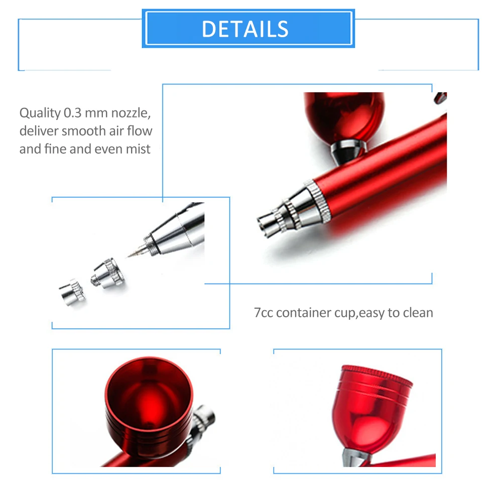 Ровный и мелкий туман-Оснащенный качественным 0,3 мм соплом, этот Аэрограф может обеспечить плавный поток воздуха и мелкий и ровный туман, что позволяет легко наносить краску, чтобы помочь вам достичь эффекта желания.