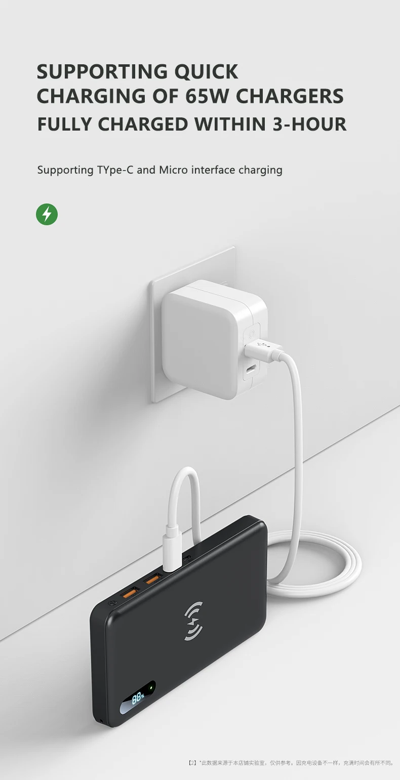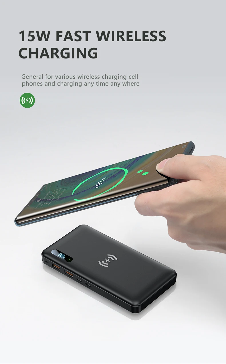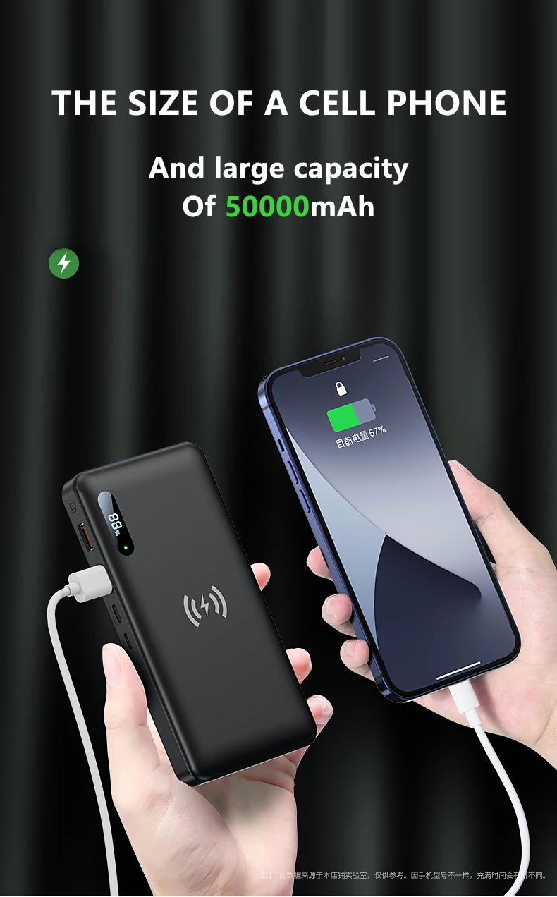 Параметры: 1. Материал: пластик 2. Батарея: литий-полимерный аккумулятор 50000 мАч 3.TypeC Вход: 20 В/3.25A,12 В/3.25A,9 В/3.25A,5 В/4A 4. Тип C Выход: 20 В/3.25A,12 В/3.25A,9 В/3.25A,5 В/4A Микро вход: 5V-4A (макс.) 9V-2A Выход USB: 5V-3A (макс.) 9V-2A (макс.) 12V-1.5A (макс.) 5. Беспроводная зарядка: 15 Вт" Размер изделия: 160*84*27 мм Вес нетто продукта: 500 г