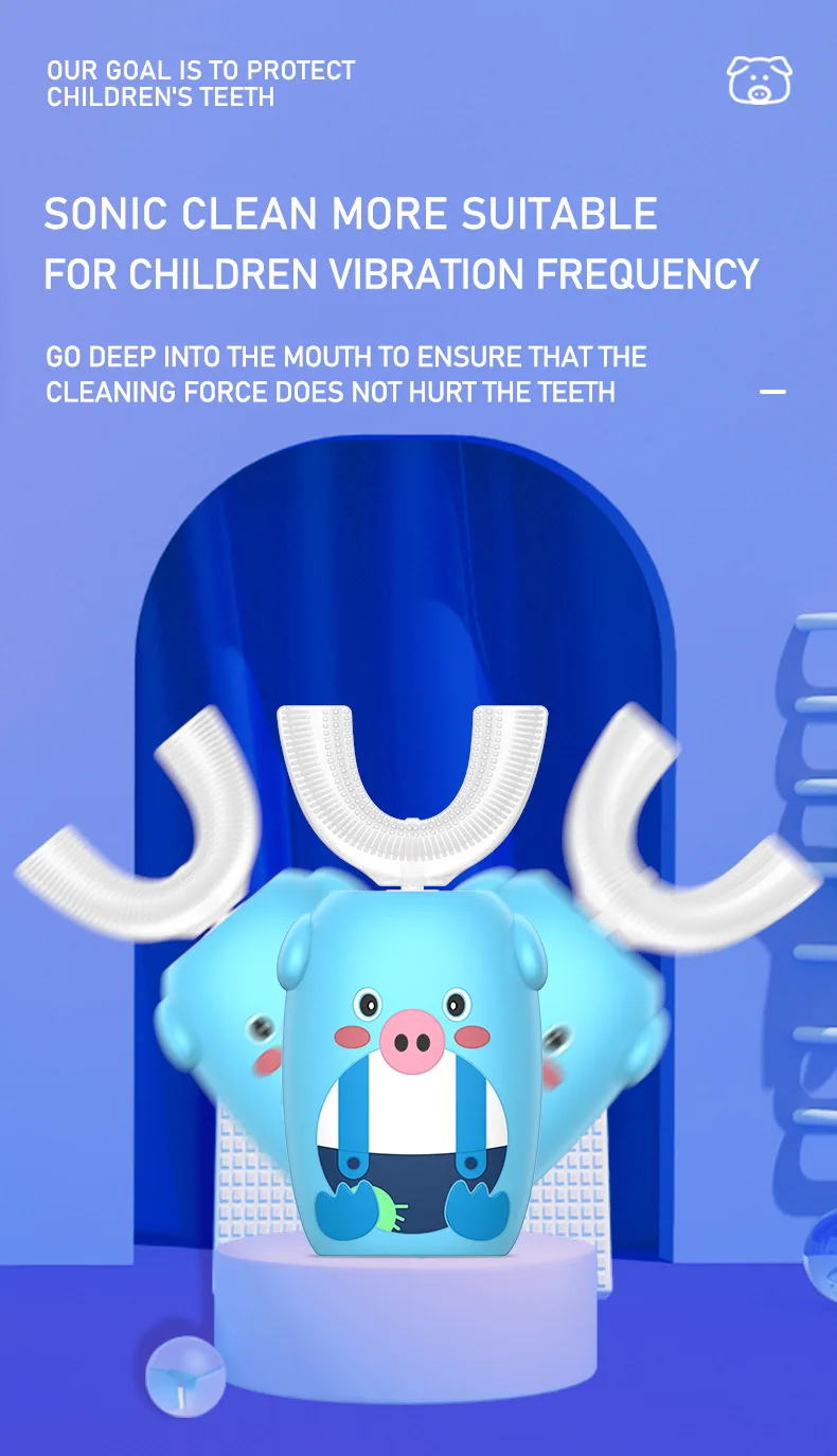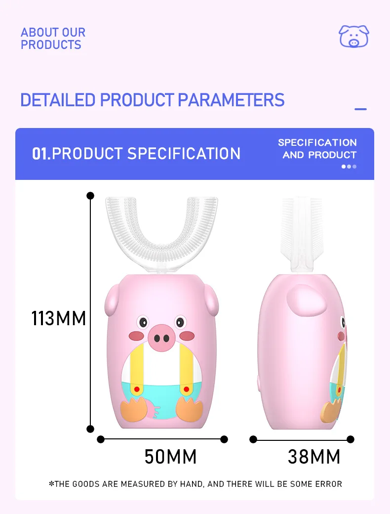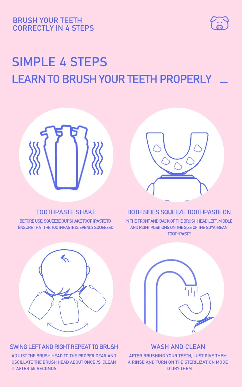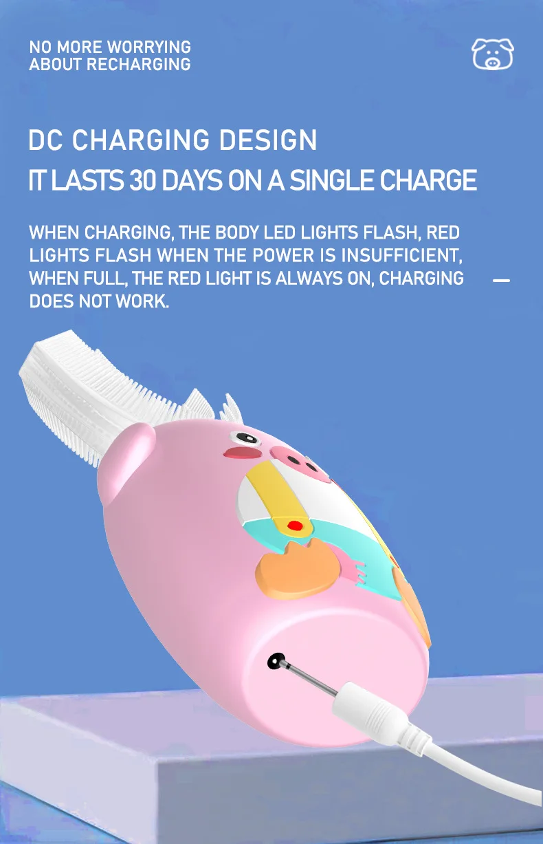 Материал: АБС-пластик, силикон Номинальное напряжение: 5 В Номинальная Мощность: 1,6 W Рабочий ток: 0.38A Время зарядки: <180 мин Водонепроницаемость: IPX7 Размер изделия: прибл. 52*42*111 мм Посылка включает в себя: 1 электрическая зубная щетка, 1 u-образная головка щетки, 1 зарядный кабель Особенности: 1. U-образный дизайн может полностью соприкасаться с деснами и зубами с эргономичной идеальной посадкой, быстро завершить движение кисти на 360 градусов с высокой эффективностью. 2. Пищевой силиконовый материал, нетоксичный и без запаха, обеспечивает мягкое и гибкое прикосновение к комфорту, антибактериальный для повышения безопасности использования, прочный в течение длительного времени Сью без легкой деформации. 3. Три регулируемых режима и высокая плотность массажа щетины могут сильно гарантировать комфортный массаж десен и эффективную очистку зубов для укрепления здоровья зубов. 4.IPX7 Водонепроницаемая конструкция уплотнения для чистки и поддержания удобства, может безопасно использоваться в ванной и душе. 5. Автоматическая функция синхронизации, она автоматически отключится после 120s работы в одном режиме с паузой каждые 30 с, чтобы напомнить вам очистить другие части ваших зубов, больше не беспокойтесь о слишком долгом или недостаточном использовании времени, не стесняйтесь делать что-то другое одновременно. 6. Милый внешний вид в форме мультяшной свинки повысит интерес детей к чистке зубов и поможет детям развивать привычку чистить зубы каждый день, подходит для детей 2-7 лет. 7. Встроенная перезаряжаемая батарея обеспечивает беспроводную работу и непрерывное удовольствие, идеально подходит как для дома, так и для путешествий с доступной Стоматологической Помощью в любое время и в любом месте. Инструкции по использованию: 1. Плотно Установите головку кисти на основной корпус. 2. Впрыскивайте зубную пасту из пены или обычную зубную пасту в головку кисти. (Примечание: обычная зубная паста должна быть увлажнена, затем помещена в рот.) 3. Прикусывайте верхние и нижние зубы аккуратно закрытыми к головке кисти. 4. Длительное нажатие кнопки питания для включения устройства и короткое нажатие, чтобы выбрать подходящий режим по желанию. 5. При чистке зубов настоятельно рекомендуется встряхнуть из стороны в сторону для вспомогательной очистки. 6. Удерживайте кнопку питания, чтобы выключить устройство, затем удалите щетку для очистки под проточной водой для улучшения гигиены. Внимание: 1. Пожалуйста, держите основной корпус сухим при зарядке, а источник питания составляет менее 5 в 1 А. 2. Не используйте устройство во время зарядки. Когда не используется в течение длительного времени, рекомендуется заряжать и разряжать один раз в течение трех месяцев.
