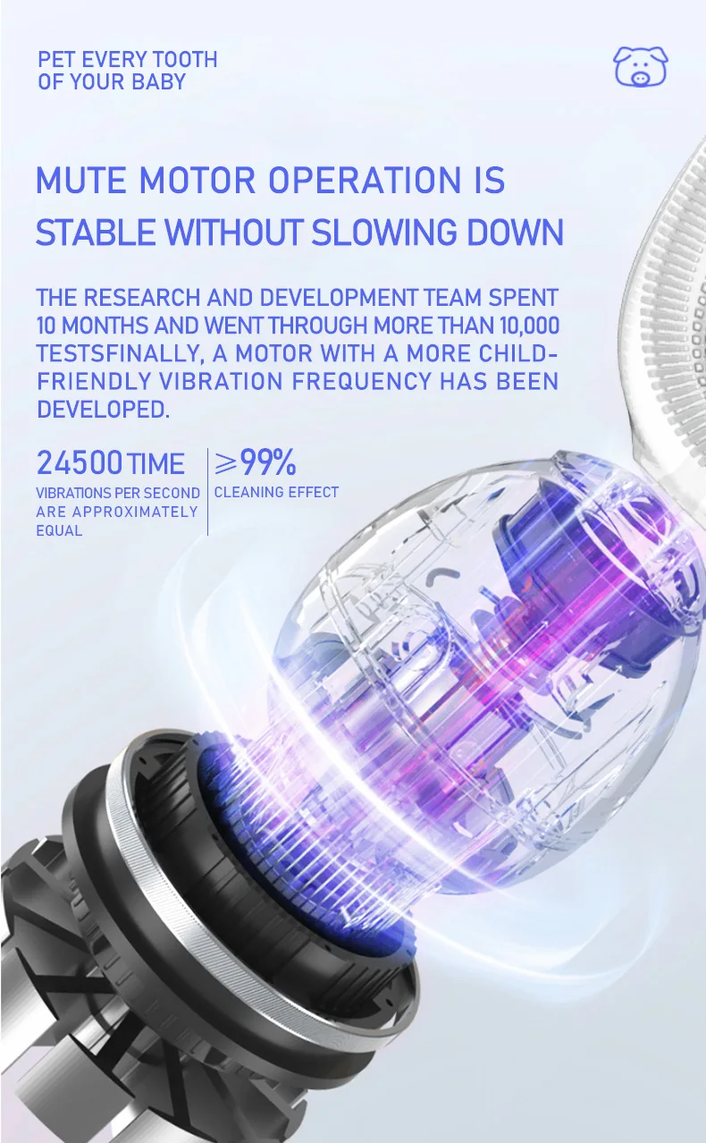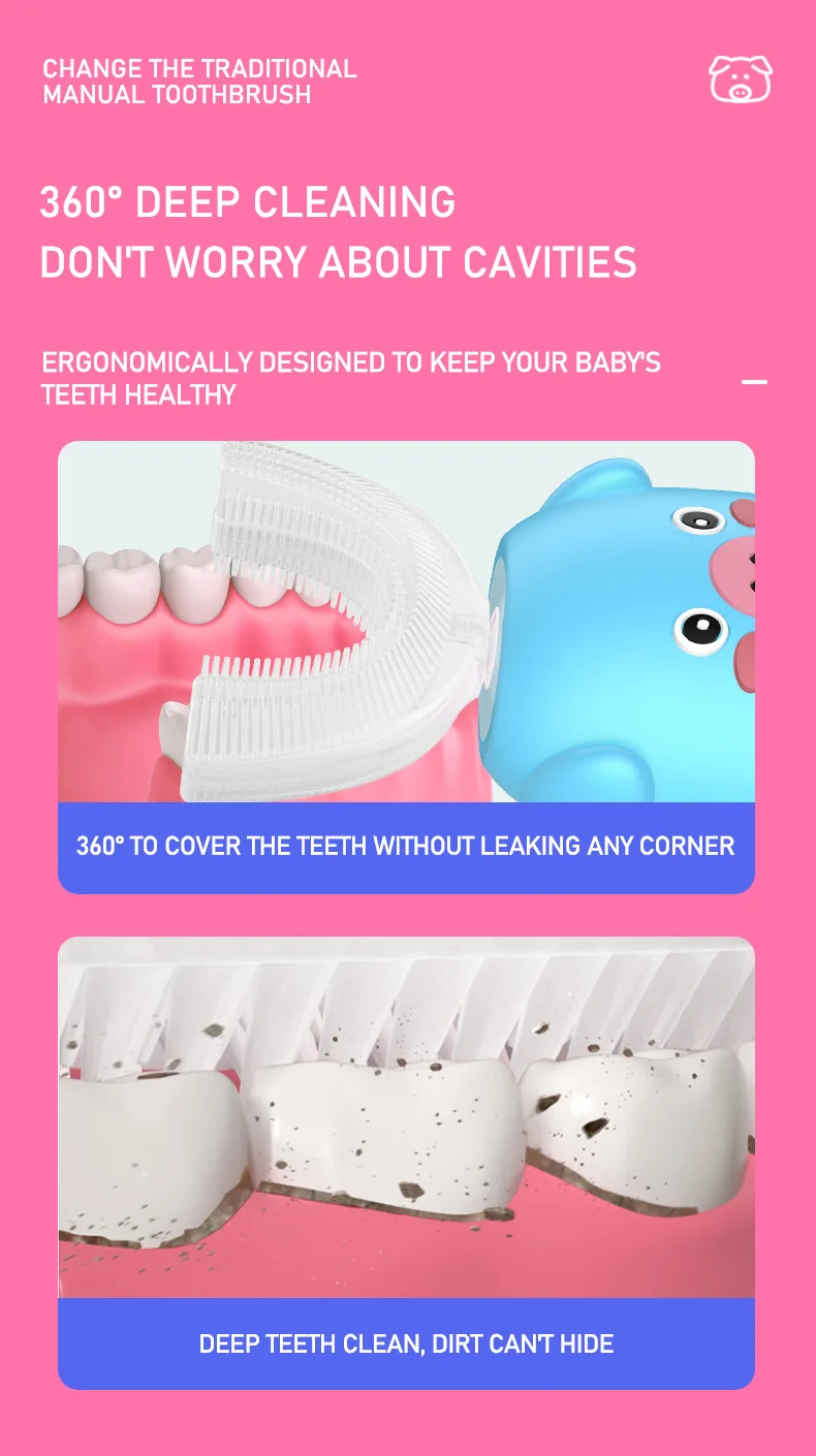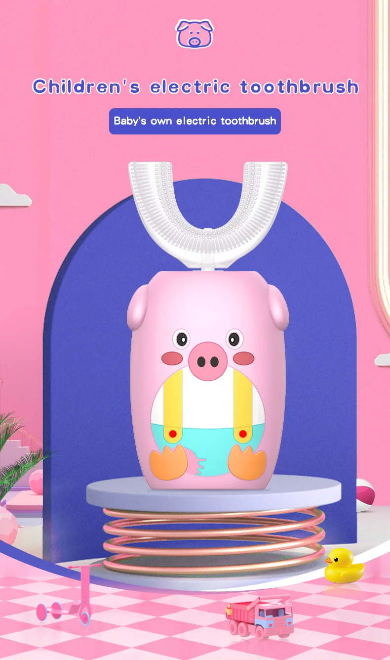 Материал: АБС-пластик, силикон Номинальное напряжение: 5 В Номинальная Мощность: 1,6 W Рабочий ток: 0.38A Время зарядки: <180 мин Водонепроницаемость: IPX7 Размер изделия: прибл. 52*42*111 мм Посылка включает в себя: 1 электрическая зубная щетка, 1 u-образная головка щетки, 1 зарядный кабель Особенности: 1. U-образный дизайн может полностью соприкасаться с деснами и зубами с эргономичной идеальной посадкой, быстро завершить движение кисти на 360 градусов с высокой эффективностью. 2. Пищевой силиконовый материал, нетоксичный и без запаха, обеспечивает мягкое и гибкое прикосновение к комфорту, антибактериальный для повышения безопасности использования, прочный в течение длительного времени Сью без легкой деформации. 3. Три регулируемых режима и высокая плотность массажа щетины могут сильно гарантировать комфортный массаж десен и эффективную очистку зубов для укрепления здоровья зубов. 4.IPX7 Водонепроницаемая конструкция уплотнения для чистки и поддержания удобства, может безопасно использоваться в ванной и душе. 5. Автоматическая функция синхронизации, она автоматически отключится после 120s работы в одном режиме с паузой каждые 30 с, чтобы напомнить вам очистить другие части ваших зубов, больше не беспокойтесь о слишком долгом или недостаточном использовании времени, не стесняйтесь делать что-то другое одновременно. 6. Милый внешний вид в форме мультяшной свинки повысит интерес детей к чистке зубов и поможет детям развивать привычку чистить зубы каждый день, подходит для детей 2-7 лет. 7. Встроенная перезаряжаемая батарея обеспечивает беспроводную работу и непрерывное удовольствие, идеально подходит как для дома, так и для путешествий с доступной Стоматологической Помощью в любое время и в любом месте. Инструкции по использованию: 1. Плотно Установите головку кисти на основной корпус. 2. Впрыскивайте зубную пасту из пены или обычную зубную пасту в головку кисти. (Примечание: обычная зубная паста должна быть увлажнена, затем помещена в рот.) 3. Прикусывайте верхние и нижние зубы аккуратно закрытыми к головке кисти. 4. Длительное нажатие кнопки питания для включения устройства и короткое нажатие, чтобы выбрать подходящий режим по желанию. 5. При чистке зубов настоятельно рекомендуется встряхнуть из стороны в сторону для вспомогательной очистки. 6. Удерживайте кнопку питания, чтобы выключить устройство, затем удалите щетку для очистки под проточной водой для улучшения гигиены. Внимание: 1. Пожалуйста, держите основной корпус сухим при зарядке, а источник питания составляет менее 5 в 1 А. 2. Не используйте устройство во время зарядки. Когда не используется в течение длительного времени, рекомендуется заряжать и разряжать один раз в течение трех месяцев.