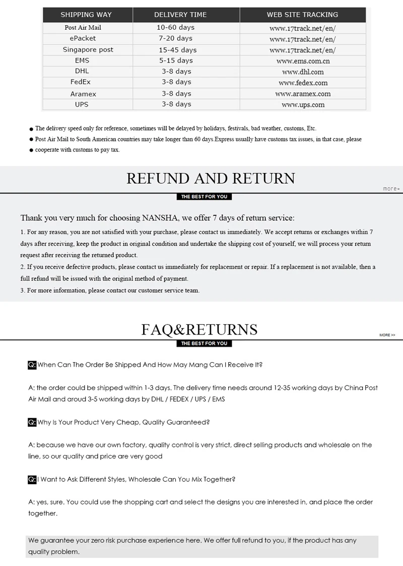 -Как правило, мы доставляем посылка вам в течение 2 рабочих дней, но если в Китае есть крупные акции или праздники на AliExpress, посылка может быть отложена. -Когда мы отправляем небольшие посылки, не превышающие 2 кг, при нормальных обстоятельствах тариф не будет, но если вы выберете Экспресс-доставку, при нормальных обстоятельствах будет взиматься плата. -Если вы хотите изменить информацию о заказе перед отправкой, пожалуйста, свяжитесь с нами вовремя. Информация об упаковке не будет изменена после отправки. О цвете и весе Для разных партий товара вес продукта может немного отличаться, и цвет, который вы видите на разных мониторах, также может отличаться. Если вы беспокоитесь о весе и цвете, пожалуйста, свяжитесь с нами, чтобы подтвердить перед покупкой. О сервисе Мы стремимся предоставить вам лучший опыт покупок, поэтому, если у вас возникнут какие-либо проблемы во время покупок, пожалуйста, свяжитесь с нами. Плохой аудит ничего не исправит, но мы можем, поэтому, пожалуйста, свяжитесь с нами перед проверкой, и мы постараемся решить проблему для вас. О магазине Мы являемся прямой фабрикой, мы поддерживаем розничную, оптовую и обычную продукцию. Если у вас есть какие-либо потребности, пожалуйста, свяжитесь с нами. Но из-за разницы во времени мы можем ответить немного поздно, но мы обязательно свяжемся с вами после того, как увидим ваше сообщение.
