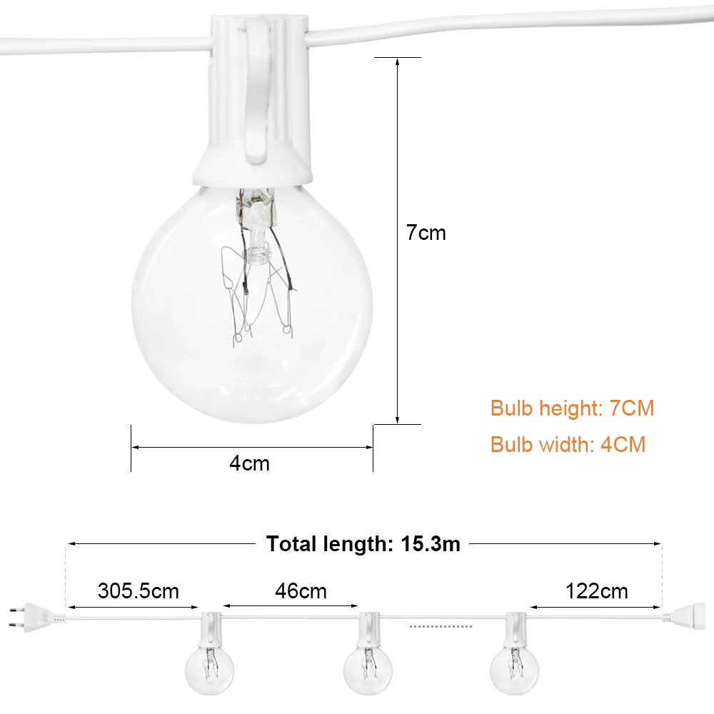 Общая длина (от конца до конца): 15 метров с 25 лампами, 30 м с 60 лампами