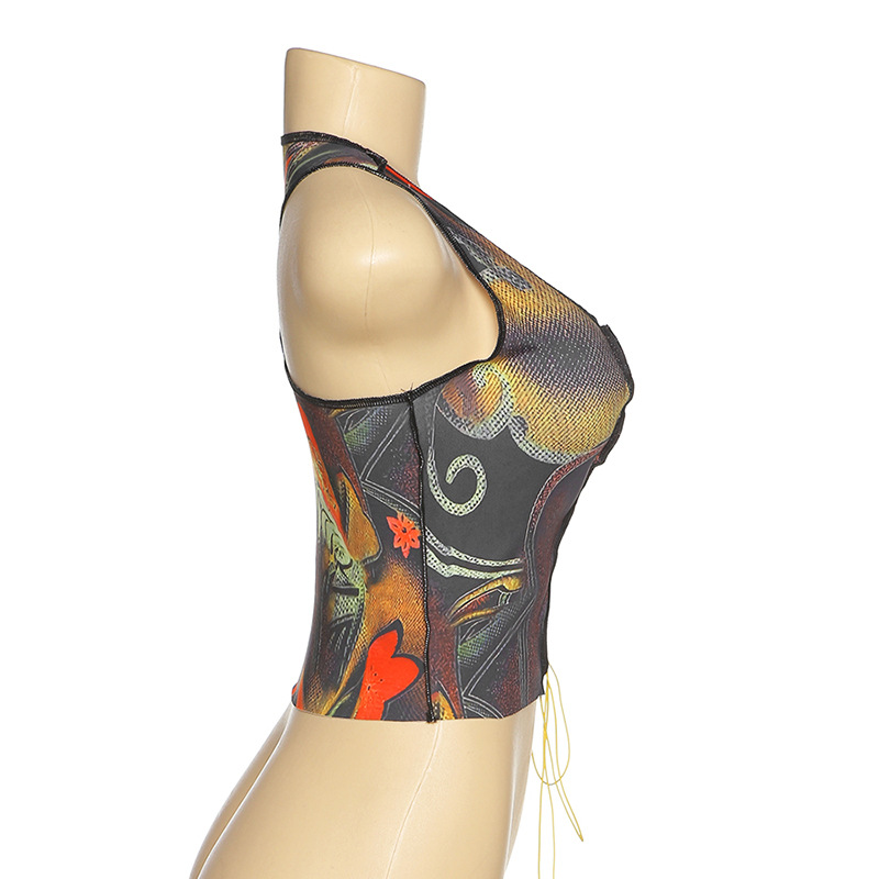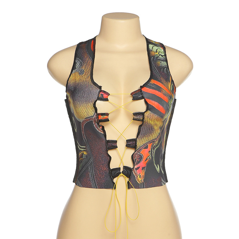 Женский сексуальный укороченный топ на бретелях, в стиле панк, без рукавов, с вырезами, на шнуровке, с цветочным принтом, футболка в стиле пэчворк