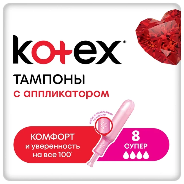 Тампоны Kotex «Super» с аппликатором обладают наибольшей впитываемостью и предназначены для обильных выделений.