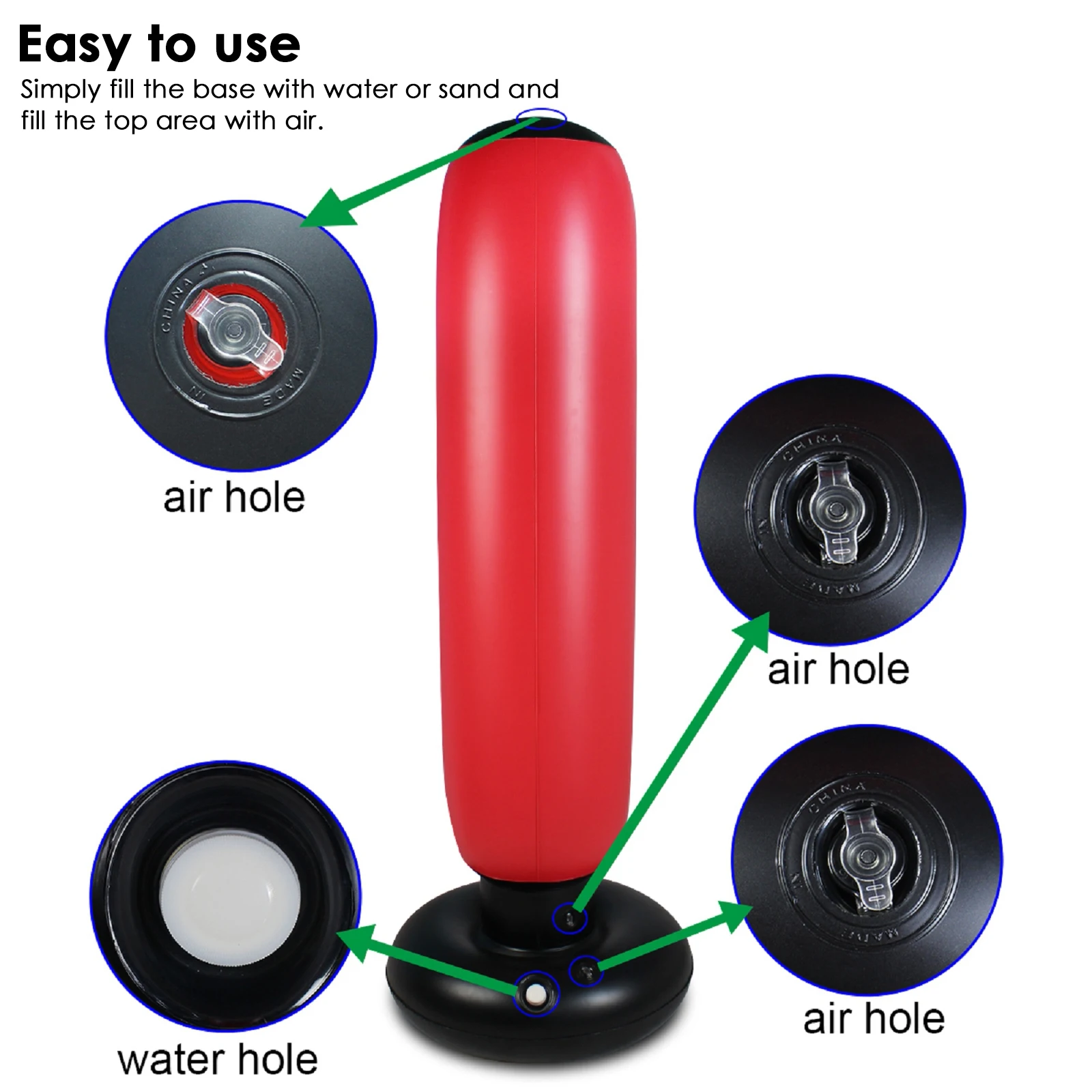Наши боксерский мешок изготовлен из 0,3 мм утолщенный материалом типом пх, надежный и не будет протекать, достаточно прочный, чтобы выдерживать ваш тяжелый удары руками и ногами, а затем быстро реагируем, передавая Резервное копирование сразу. Просто заполните нижнюю камеру песком или водой, надуйте верхнюю камеру и начните тренироваться!