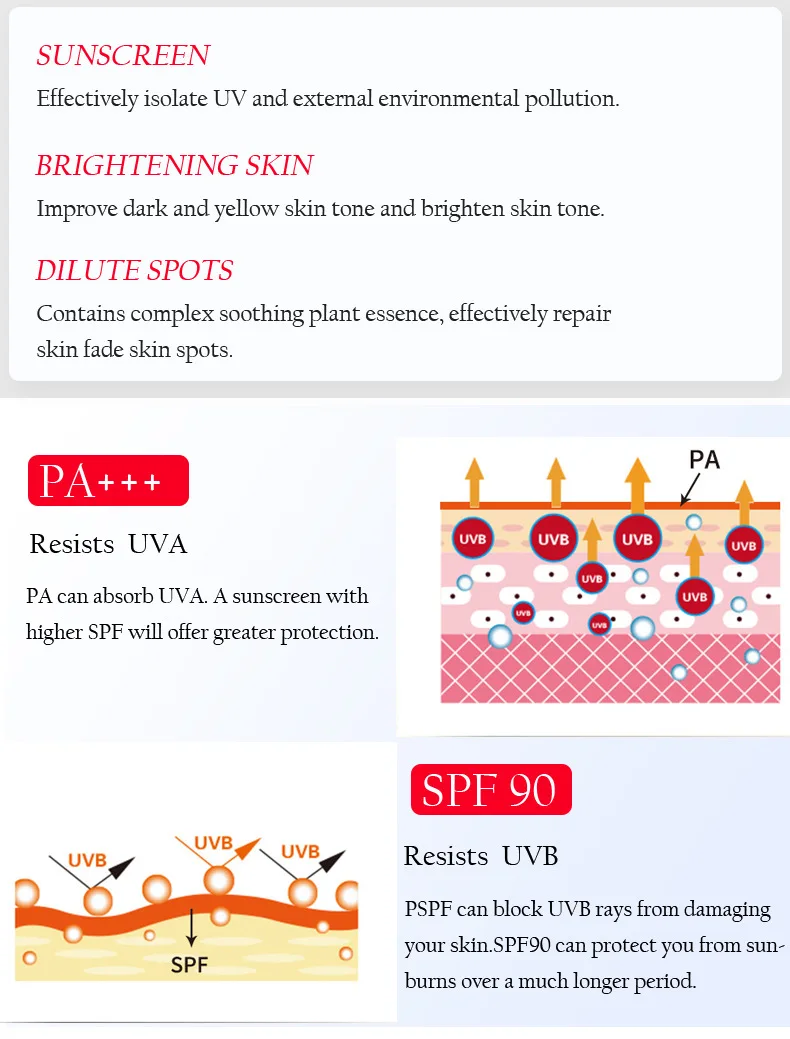 Эффективность: солнцезащитный отбеливающий освежающий антивозрастной увлажняющий уход за кожей, водонепроницаемый, предотвращает повреждение кожи от солнца