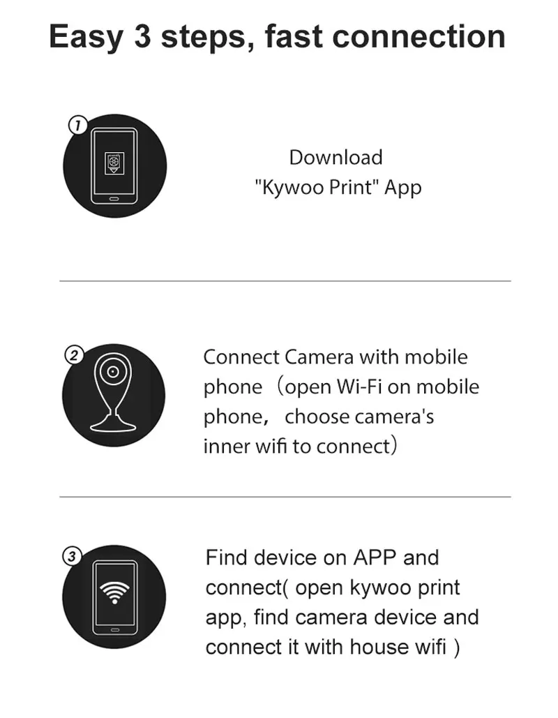 Steps2: Подключите камеру Kywoo к своему мобильный телефон (Откройте услугу Wi-Fi на вашем телефоне и выберите Wifi камеры для подключения)