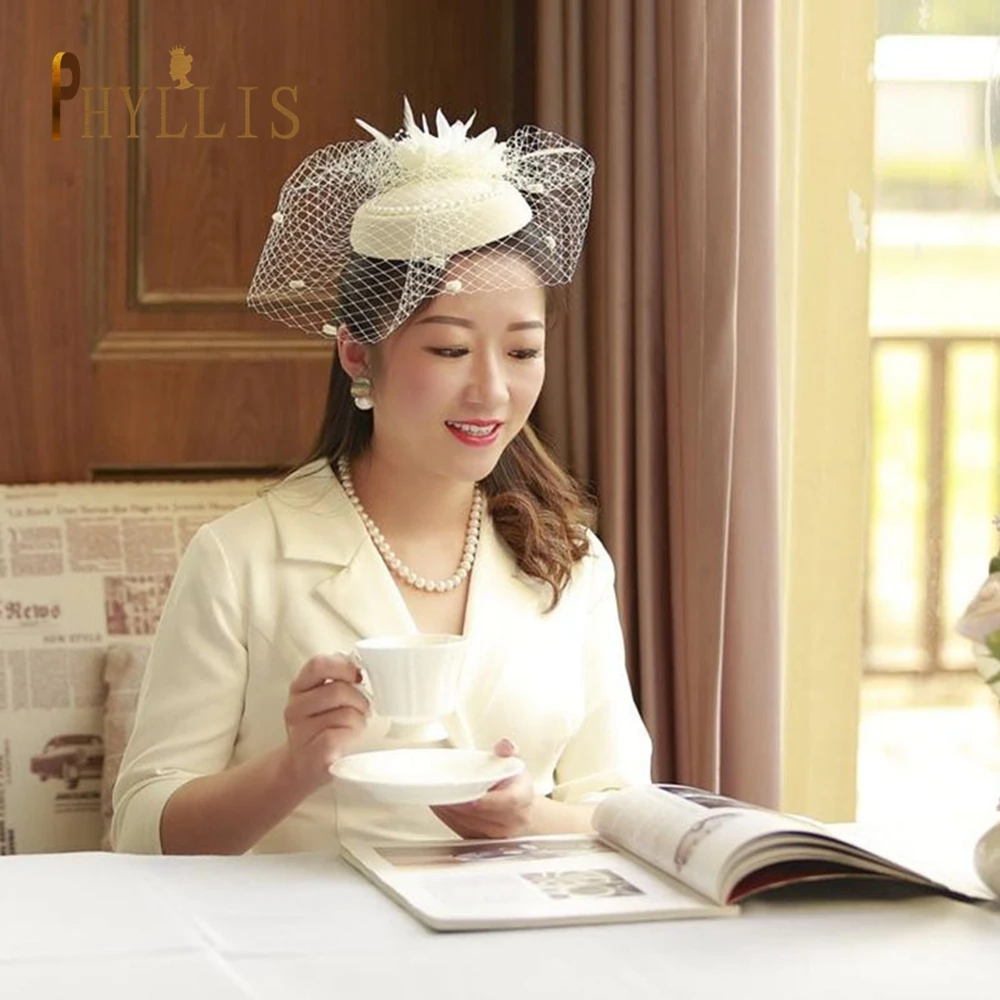 JM08 винтажные сетчатые Свадебные шапки с перьями и жемчугом для женщин вуалетки для лица Свадебные шапки свадебные аксессуары