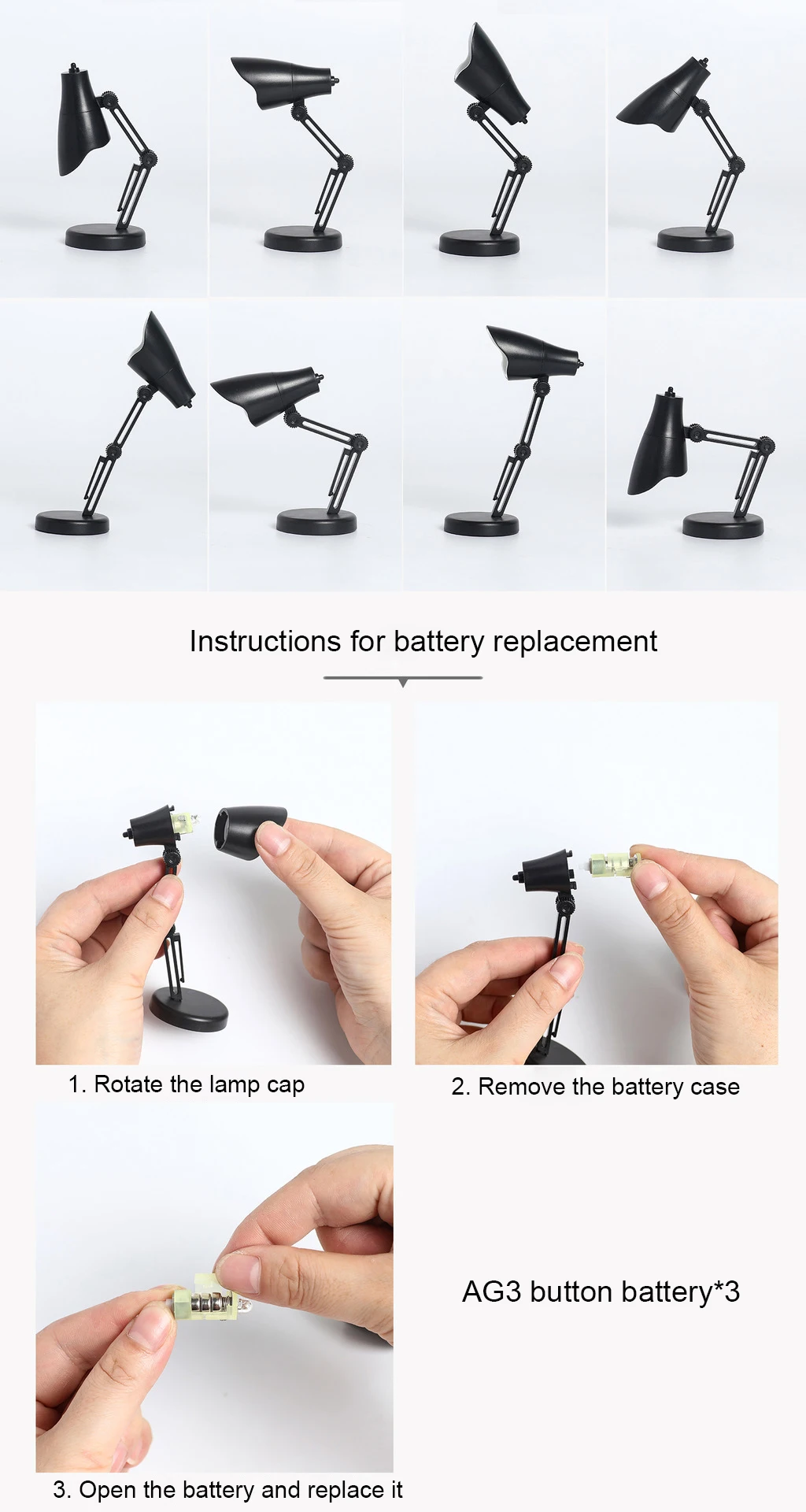 Наименование товара: ночной мини-светильник Материал: пластик Цвет: черный, желтый, белый, розовый, зеленый, красный, синий Время работы: 60-70 минут Выходная мощность: 2 Вт Батарея: AG3 кнопка батареи * 3, батарея может быть заменена свободно Инструкции по замене батареи: 1. Поверните держатель лампы 2. Выньте батарейный блок 3. Откройте батарейный блок для замены