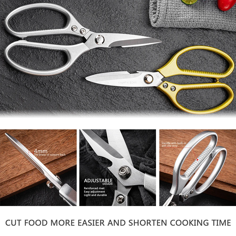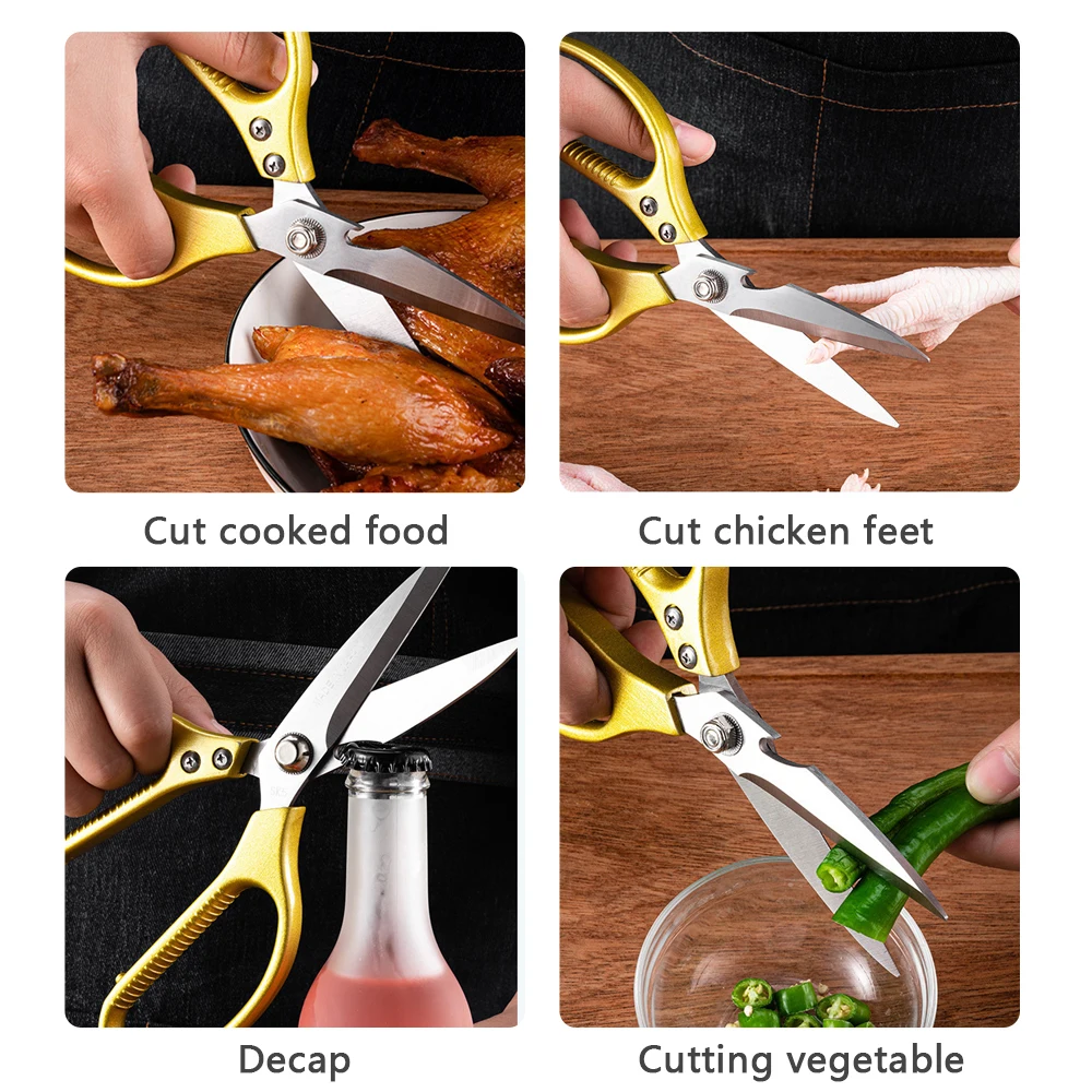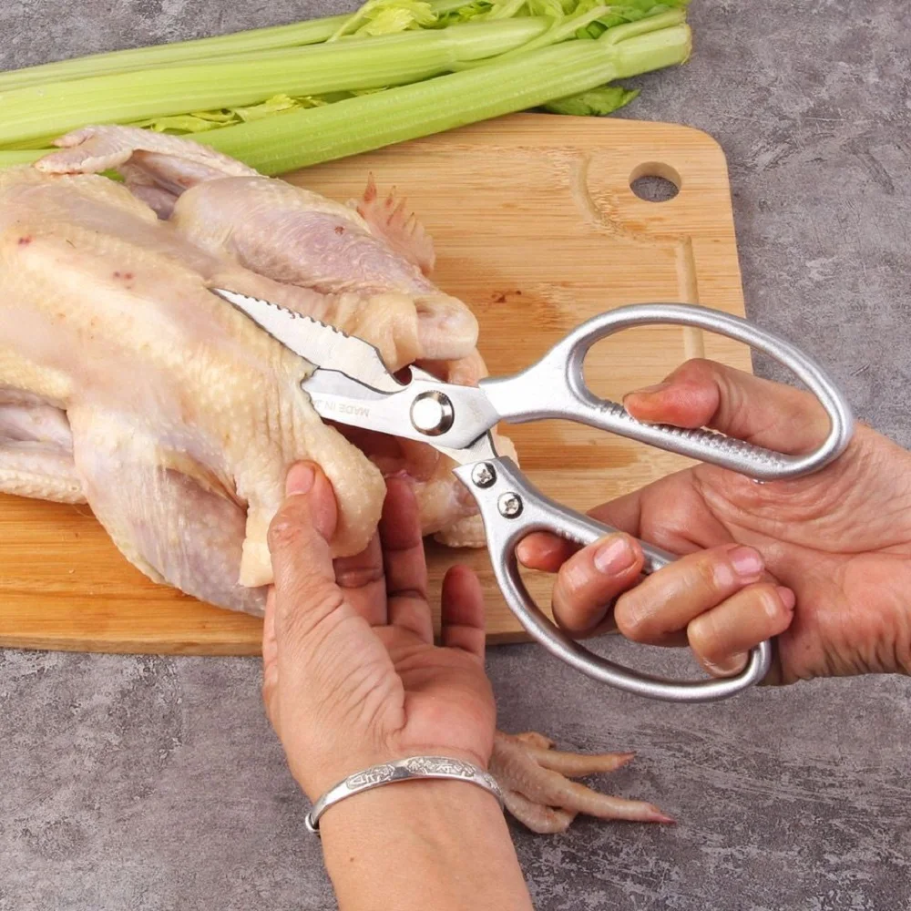 Особенности: Точная выковка из прочной нержавеющей стали, которая устойчива к ржавчине, легко чистится и балансирует высокую производительность с прочной кромкой. От измельчения, обрезки и резки свежей продукции и мяса с фермерского рынка до растрескивания орехов или скорлупы крабов. Заточные лезвия для легкой резки мяса, птицы, рыбы, овощей, обрезки жира и т. д. Не нужны универсальные или электрические ножницы, когда они у вас на кухне. Хорошо сделанные ручки, удобные и Нескользящие. Легко моется. Только ручная стирка. Характеристики: Материал: резак из нержавеющей стали, алюминиевая ручка Размер: как показано на фотографии