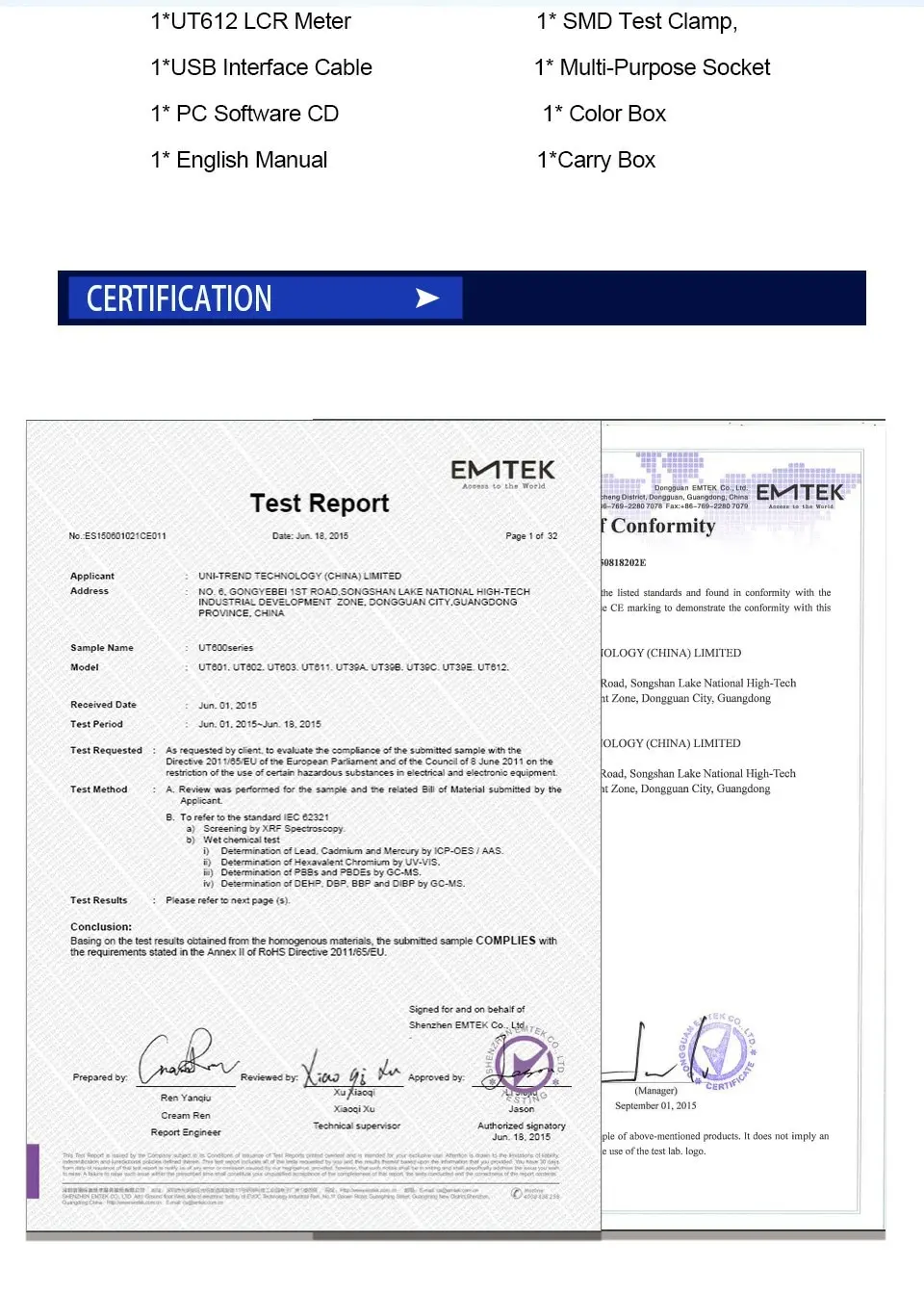 SMD тестовый зажим, USB интерфейсный кабель (UT612), Многоцелевой разъем (UT612), PC программное обеспечение CD (UT612) |
