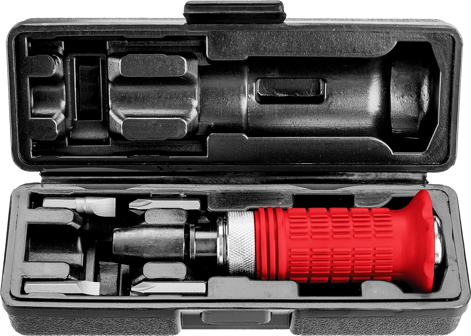 Отвертка ударная – 1 шт. Биты 36 мм, 4 шт.: SL7, SL8, PH2, PH3. Адаптер для бит SQ 1/2"F-HEX 5/16"F – 1 шт.